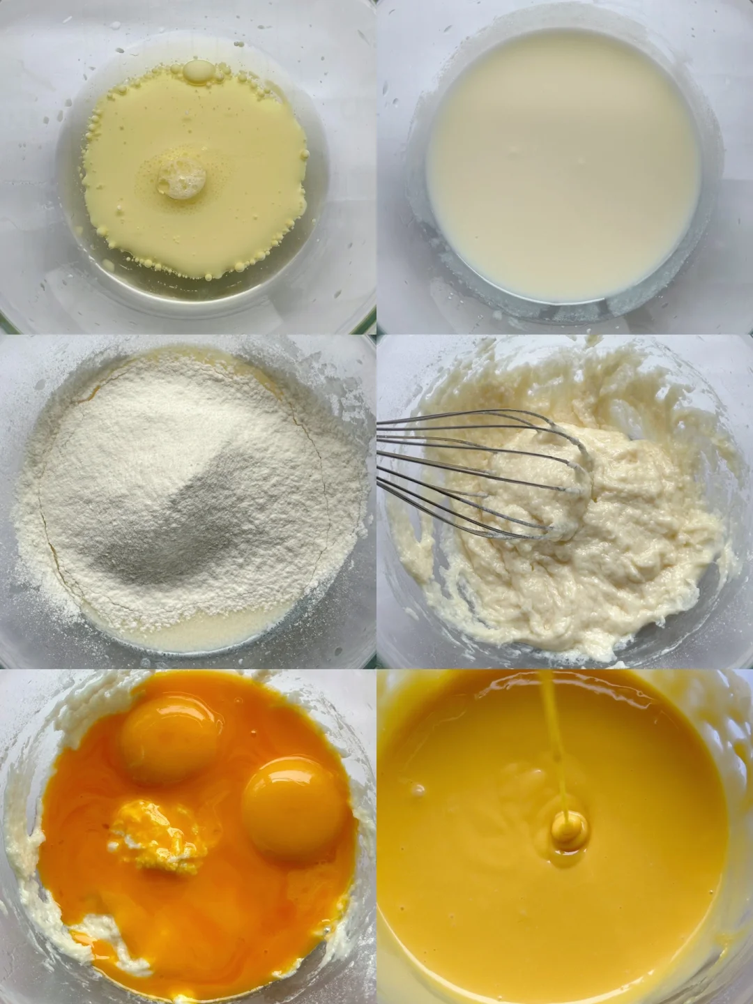 💞将牛奶、玉米油画圈搅拌至完全乳化。筛入低筋面粉,画一字或Z字混匀。