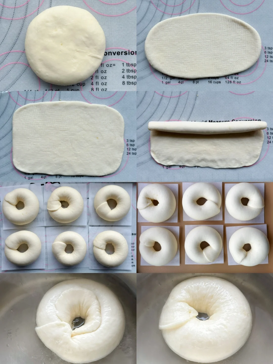 6️⃣80s烤箱提前200度预热,发酵结束前5分钟开始煮糖水,煮至接近沸腾,大概90度,转小火,放入贝果,正反面各煮30秒,捞出沥干。