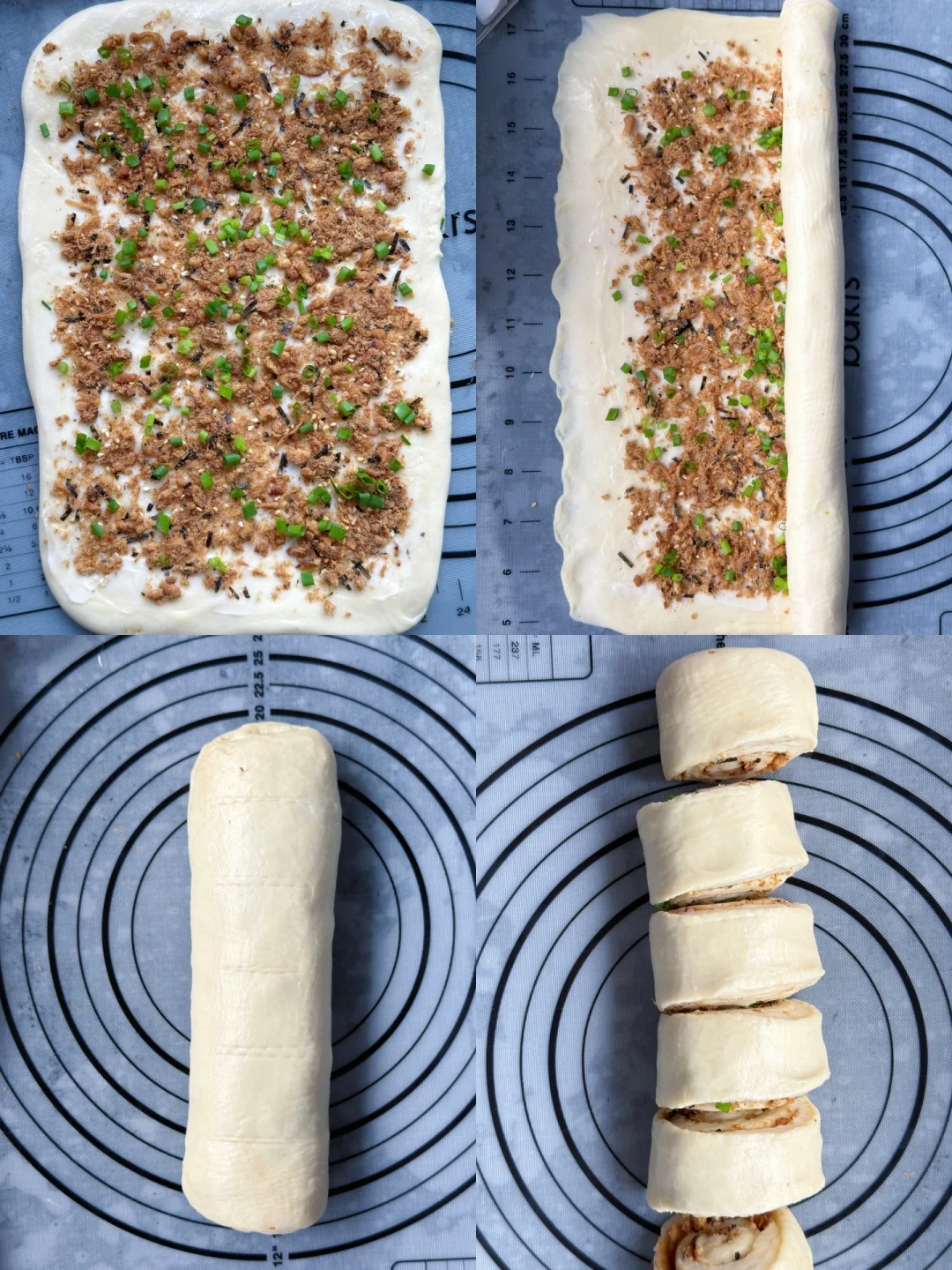 🔺松弛好的面团直接擀成长方形面片,表面刷上一层沙拉酱,再撒上一层肉松和适量葱花,卷起来,切成小段。