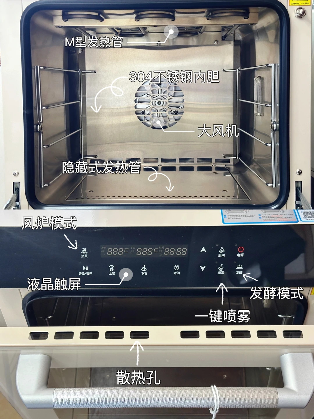 2️⃣ 上下M型管独立控温,下发热管为隐藏式,蓄热好清洗,常温-260°C可调,食品级304不锈钢内胆,升温快,清洁方便。内置耐高温炉灯,可常亮,烤箱内部情况清晰可见。
