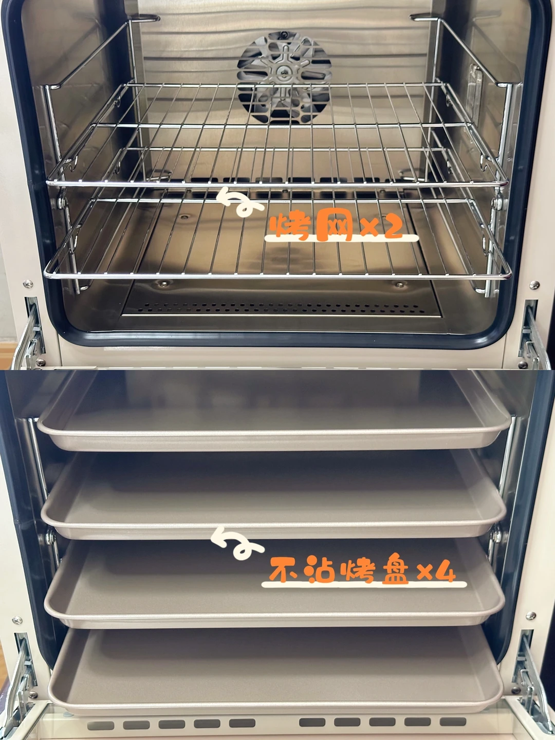 1️⃣智能触屏,实时显温。开机默认平炉模式,点风炉图标转风炉模式。一机配有4烤盘,2烤网,4层同烤也不用担心烤盘不够用!