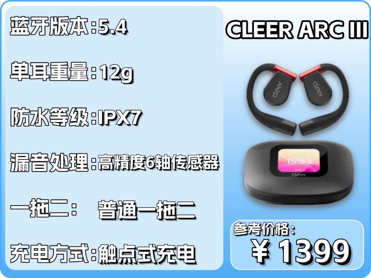CLEER ARC III采用蓝牙5.4芯片,结合双麦通话降噪技术,即便在嘈杂环境中也能实现清晰交流。其16.2mm动圈扬声器与高精度6轴传感器相辅相成,不仅有效减少声音延迟,更能精准还原音乐细节,呈现沉浸式聆听体验,高低频表现均衡且自然。在佩戴设计上,单耳仅重12g,搭配弹性仿生耳挂和0度硅胶材质,能够自适应贴合耳廓曲线,长时间佩戴无压迫感,同时避免闷堵耳道,无论是运动还是日常使用都非常舒适。其防水等级达到IPX7,可抵御雨水或汗水侵蚀。续航方面,单耳支持10小时使用,配合充电仓总续航可达40小时,满足全天候使用需求的。