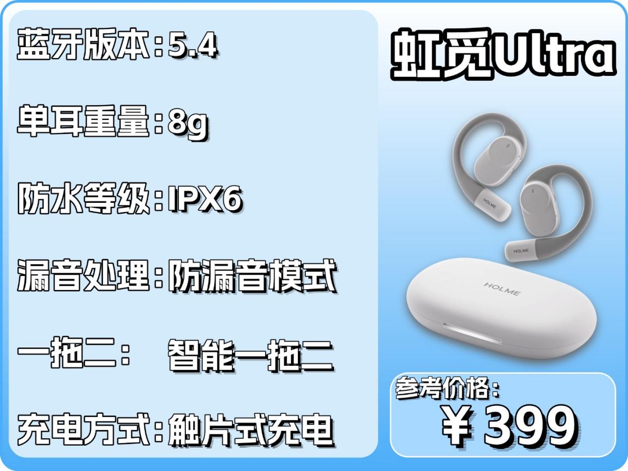 耳机的音质应该算得上是500元以下的TOP3级别,采用了16.2mm的超大尺寸动圈单元,为声音提供了更多的驱动力,不仅音量更大,同时音质也更加饱满。振膜材质选择了形变能力更强的石墨烯科技振膜,可以更细腻地还原声音,结合虹觅声学实验室更偏向于“高保真”的调音风格,让整体的声音细腻、饱满,同时还能听见更多细节。虹觅Ulrta的佩戴工学处理得很好,采用流线型设计,除了佩戴舒适以外,耳机发声孔也可以很好的正对耳洞,让声音减少泄露,音质更好。单耳重量为8g,机身采用液态硅胶包裹,柔软细腻,长时间佩戴也不会感觉耳累、耳痛。运动使用也可以保障很好的稳固性。虹觅Ulrta采用的是创新的触片式充电,改良了传统触点式充电方式的接触不良,回仓不断连,充电慢的问题。为了解决开放式耳机的漏音问题,耳机还加入了专属防漏音功能,开启功能后可以明显地降低漏音外泄的问题。配置里蓝牙5.4芯片,内置四麦高清麦克风,支持ENC通话降噪,支持IPX6级防水,智能一拖二,单耳续航8小时,综合续航32小时。可以说是目前500元以下的怪物级别的配置。