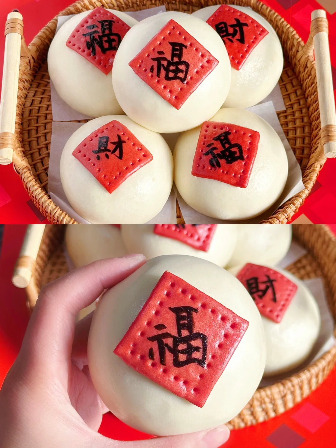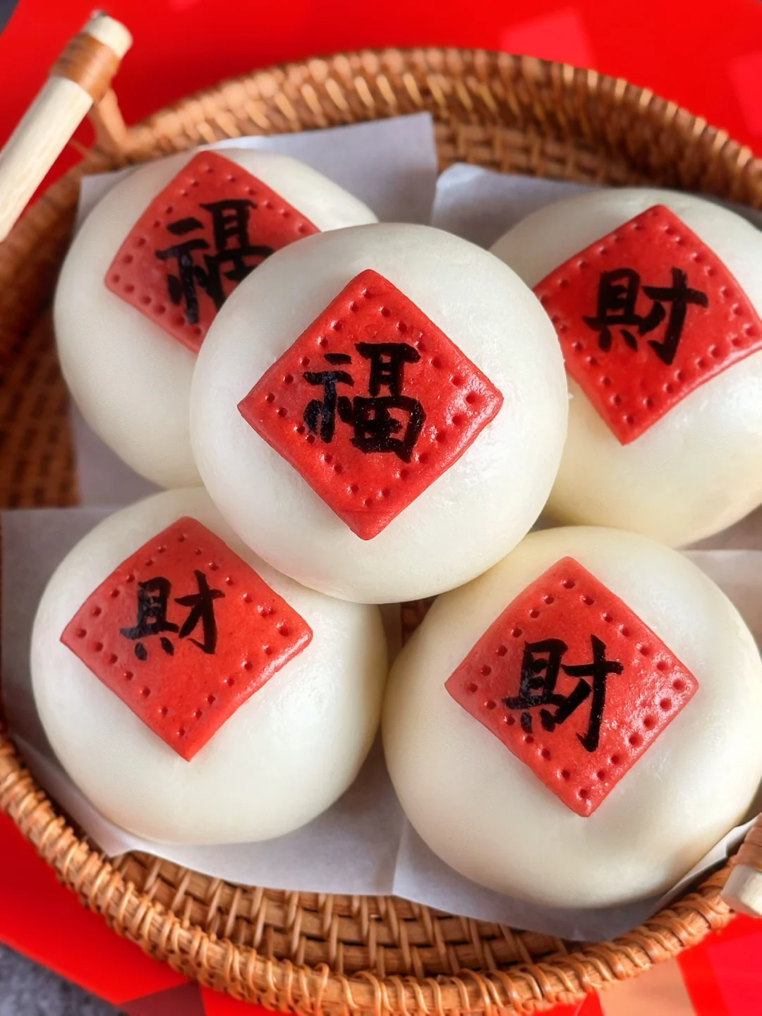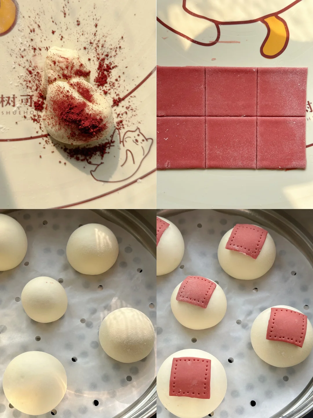 4️⃣红色面团擀成薄片,切成6片正方形面片,每一个面片四周用叉子戳上花纹,背面刷一点水,粘在做好的馒头胚上。