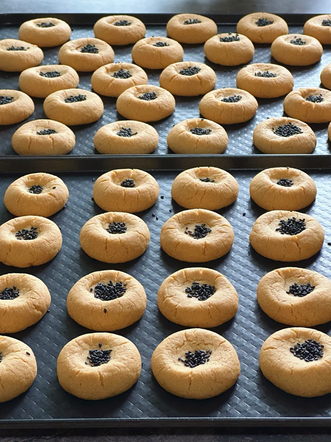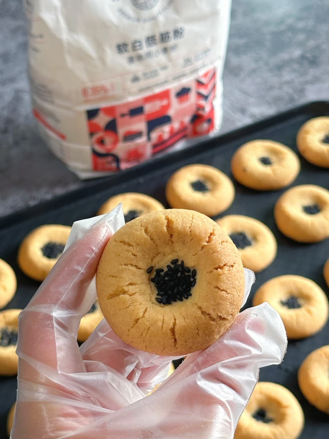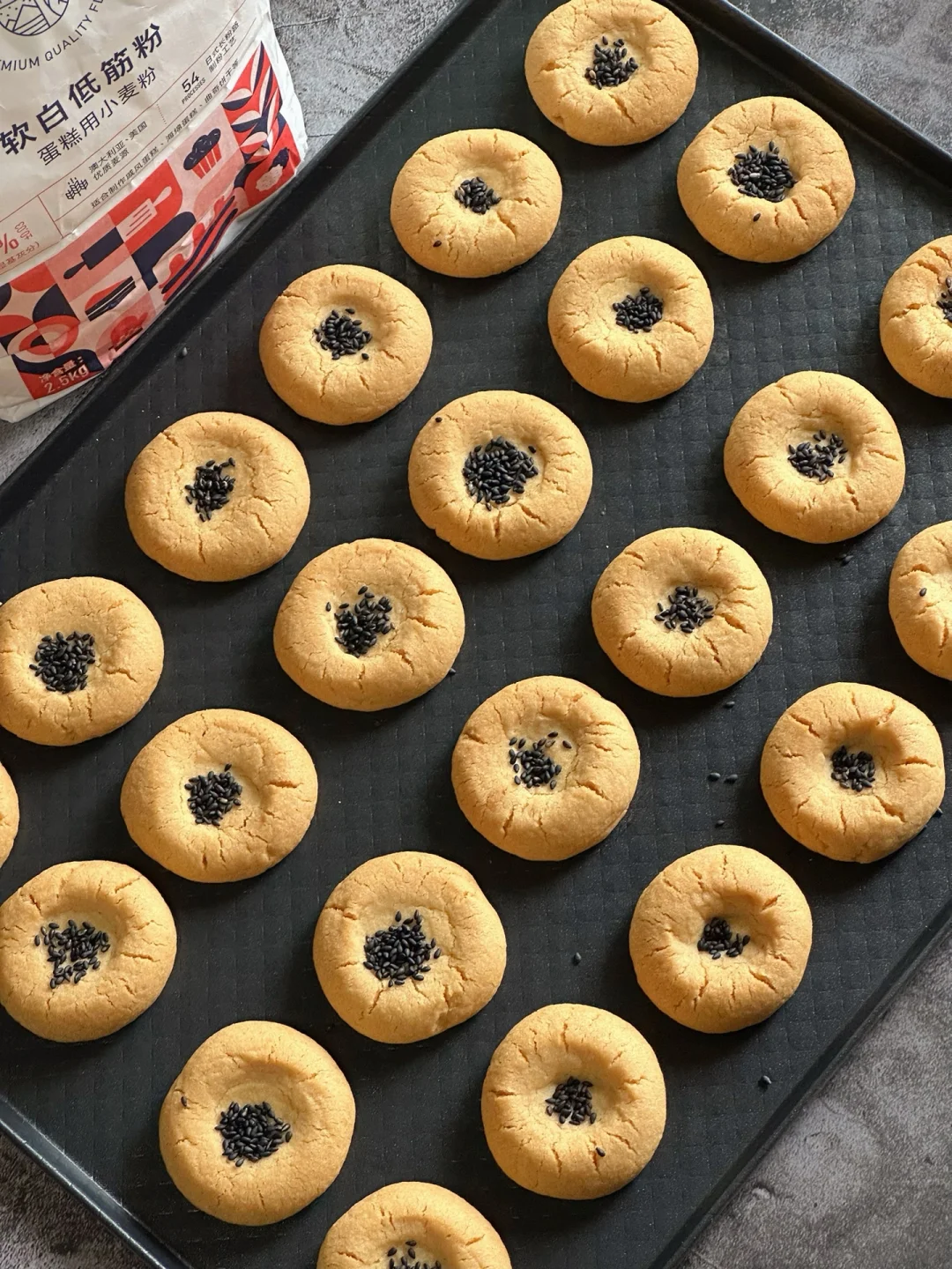 3️⃣筛入低筋粉,用刮刀切拌至无干粉,再用手抓捏成团。分成18-19g/个的小面团,搓圆,每个面团中间戳个洞,撒上黑芝麻。