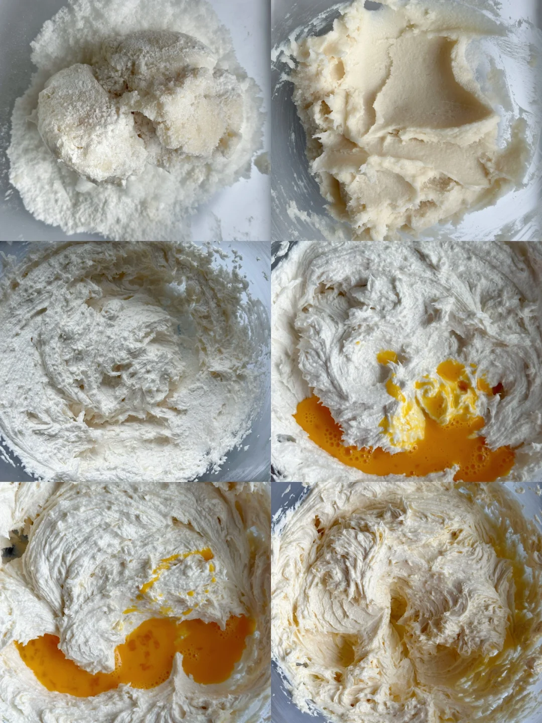 1️⃣猪油软化成膏状,加入绵白糖打至体积增大,发白(加绵白糖就会有颗粒状,比较粗糙,加糖粉,打发的猪油就会像奶油一样)