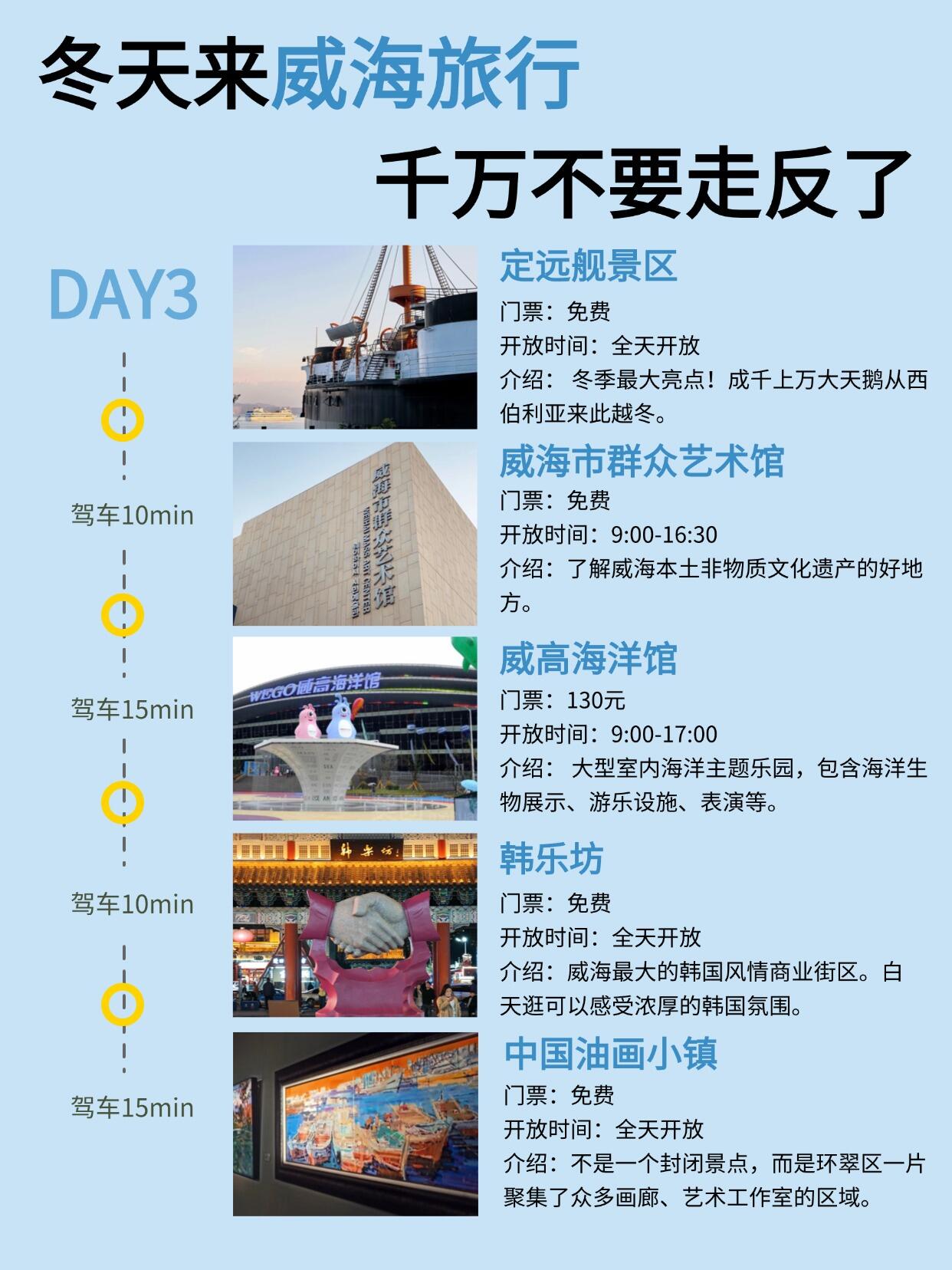 📕总结:定远舰拍照很出片。群众艺术馆和油画小镇人少安静,艺术氛围很浓。威高海洋馆暖暖的最后在韩乐坊疯狂吸入热乎乎的饭,舒服