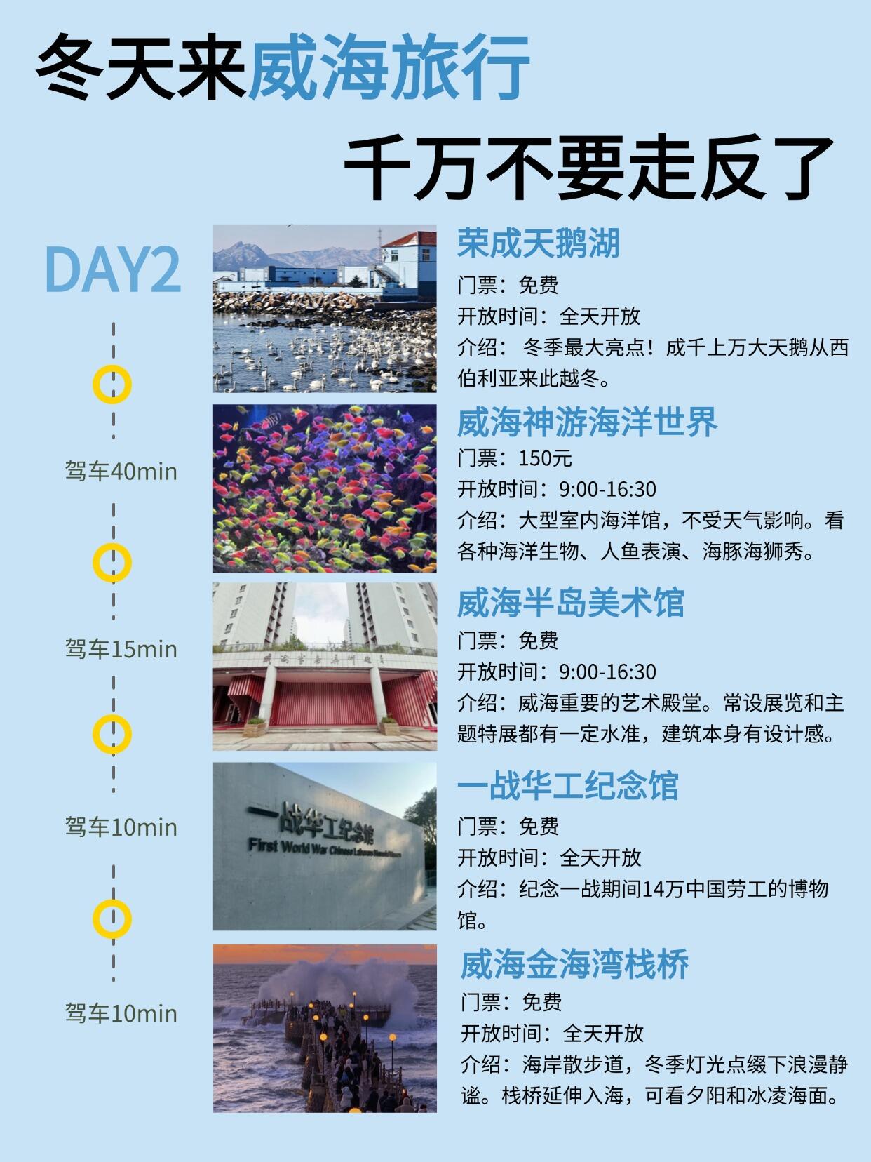 Day2:荣成天鹅湖 → 威海神游海洋世界 → 威海半岛美术馆 → 一战华工纪念馆 → 威海金海湾栈桥