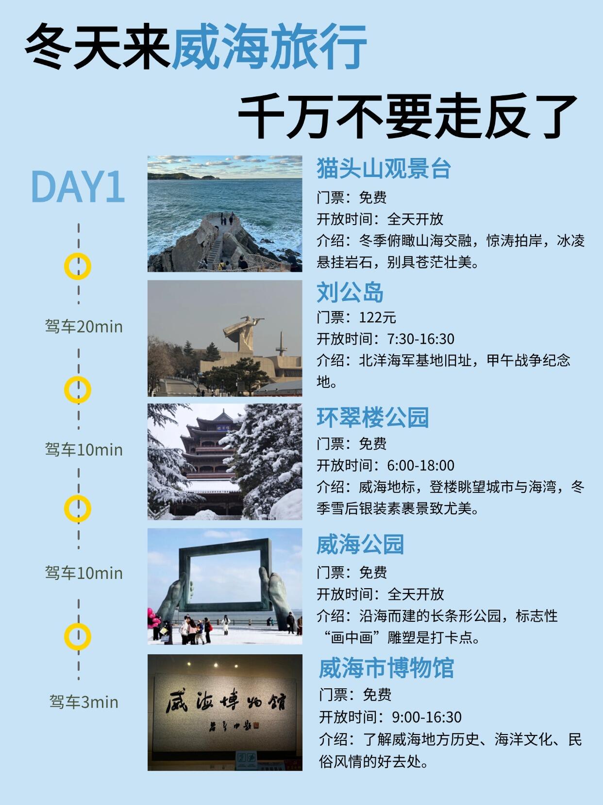 Day1:猫头山观景台 → 刘公岛 → 环翠楼公园 → 威海公园 → 威海市博物馆