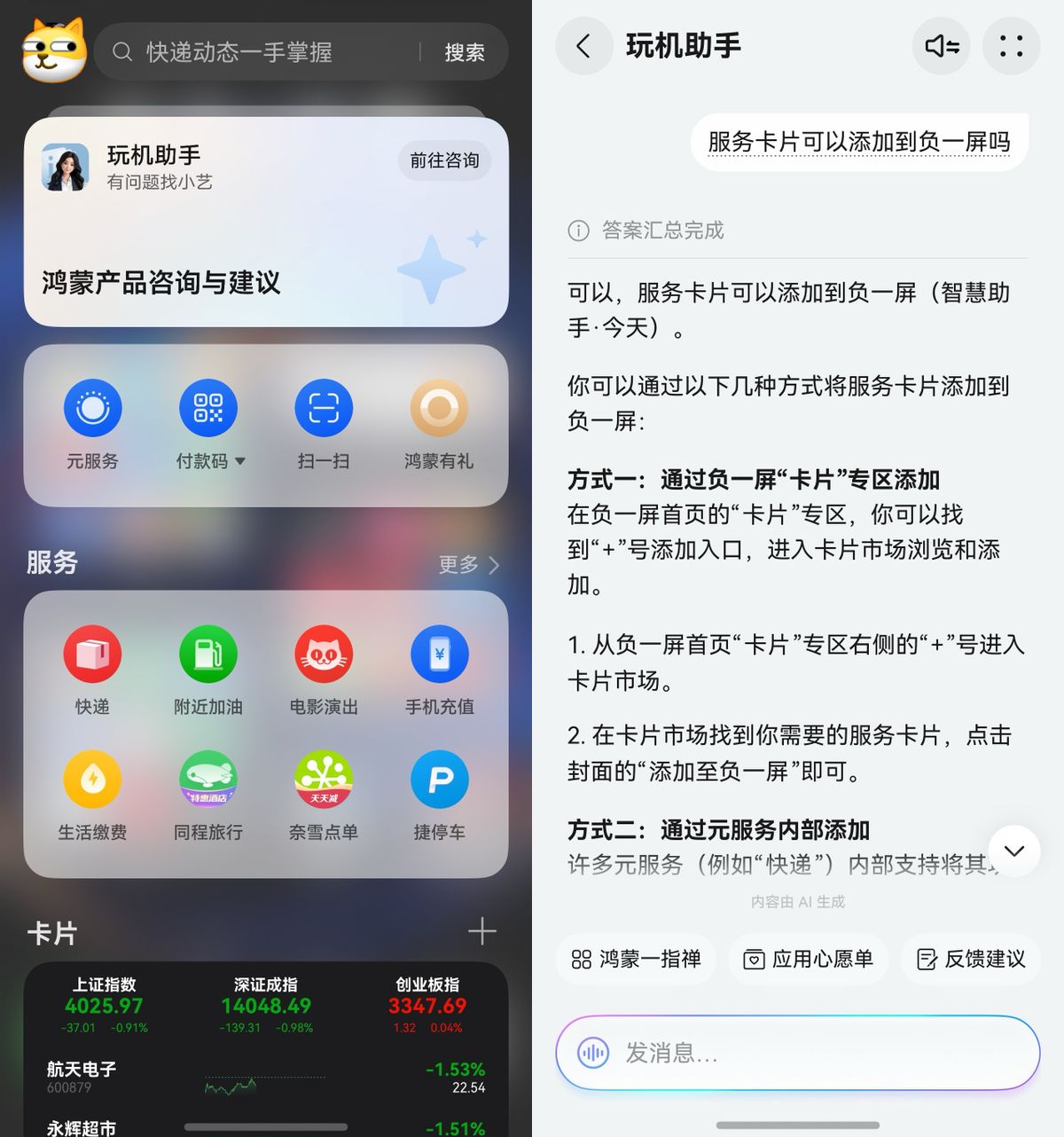 要是还有啥用机技巧还不知道,直接从桌面右滑进入负一屏的“鸿蒙产品咨询与建议”入口,在对话界面直接问问小艺就行,赶紧去试试吧!