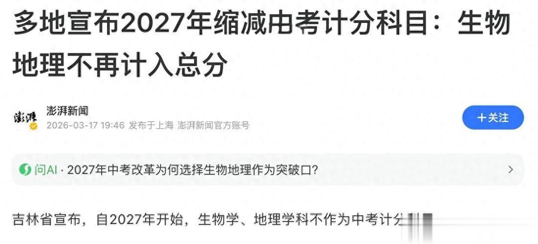 结语:生物地理“踢出”中考计分,不是“不重要了”,而是教育理念在升级——从“唯分数论”转向“全面发展”。家长们与其纠结“少考两门”,不如帮孩子培养学习兴趣,为高中选科打基础!你觉得这波调整好吗?评论区聊聊!