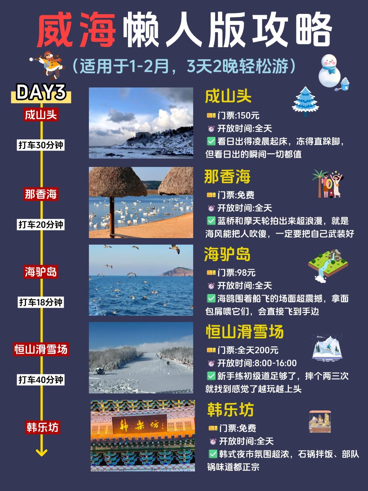 ✔️第三天路线:成山头(看日出)→那香海(拍蓝桥、摩天轮)→海驴岛(坐船喂海鸥)→恒山滑雪场(滑雪)→韩乐坊(吃晚饭)