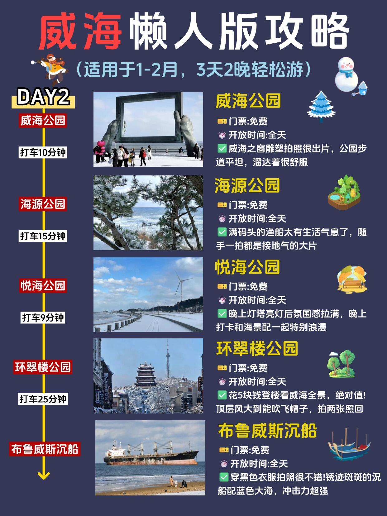 ✔️第二天路线:威海公园(威海之窗)→海源公园(看渔船)→悦海公园(灯塔夜景)→环翠楼(登顶看全景)→布鲁威斯沉船(拍照)