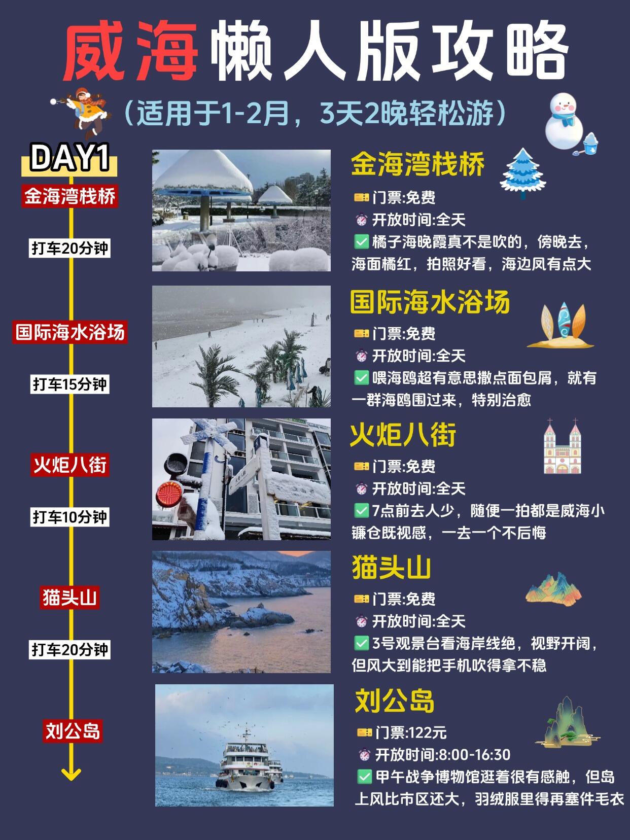 ✔️第一天路线:金海湾栈桥(看橘子海晚霞)→国际海水浴场(喂海鸥)→火炬八街(拍照)→猫头山3号观景台(看海岸线)→刘公岛(参观甲午战争博物馆)。