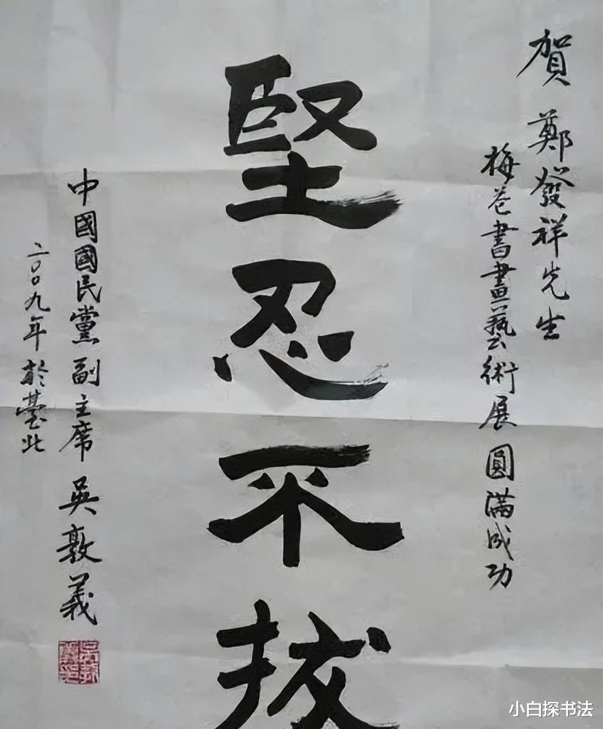 同时,我们也注意到,无论是洪秀柱的隶书,还是吴敦义的隶书,在字形的表现上,都是非常特别的,没有我们印象中的那种扁平姿态。