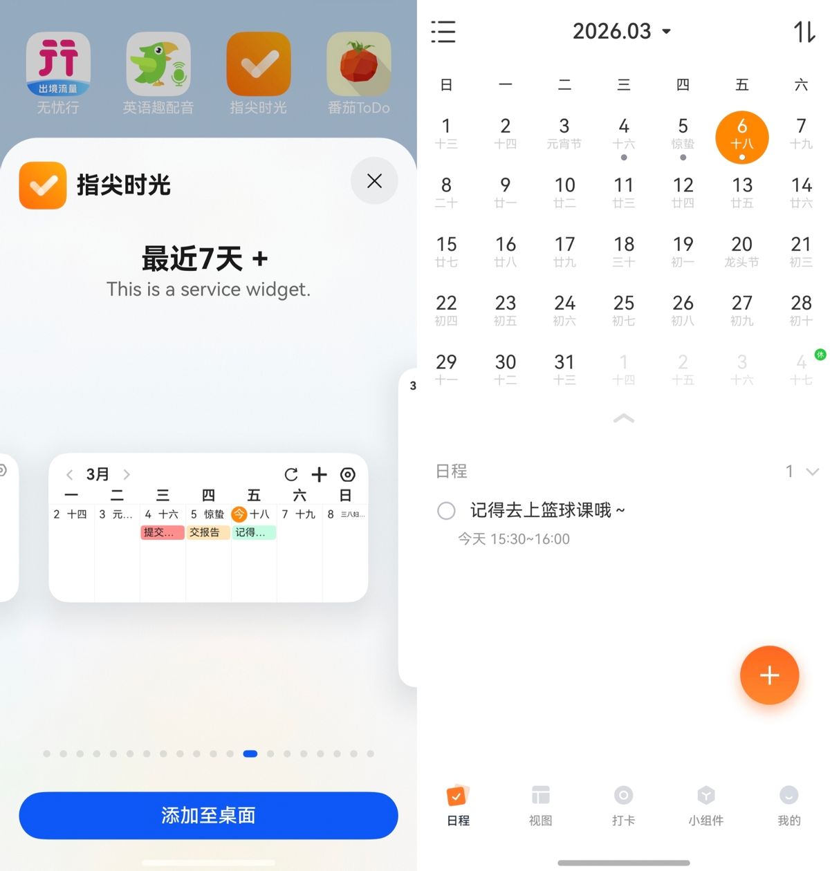 说到自主学习规划,不得不说鸿蒙版指尖时光是真的给力。我这人出了名的记性差,总忘哪天要交什么作业、哪节课要去哪里上,丢三落四更是常态。现在不一样了,我可以提前把重要的事项添加到App日程里,到点就会在通知栏弹提醒,想忘都难。这个功能对我这个马大哈来说,真的挺救命。鸿蒙版指尖时光的桌面卡片功能也很赞,20种不重样的卡片可以随心换,涵盖了日程列表、专注时长、纪念日等多种类型,实用又贴心。