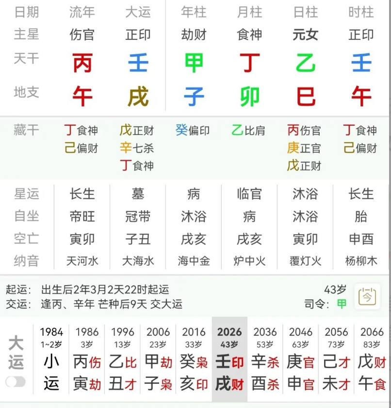 但是好在天干透丁火,正印,也代表自己会克制自己,不太好长时间消耗。食神透出也代表自己生活中会专研一些美食之类。只是做饭多了,自然也是负担。