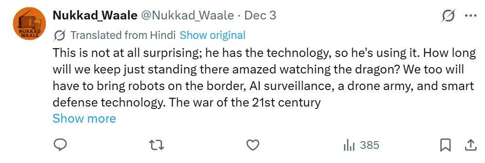 视频很快引发了国外网友热议。而这个视频的评论区里,许多印度网友对此从一开始觉得“新鲜好笑”到后来“越想越慌”,他们意识到,这或许不仅仅是一个机器人,更折射出两国在边防技术上的“代差”。
