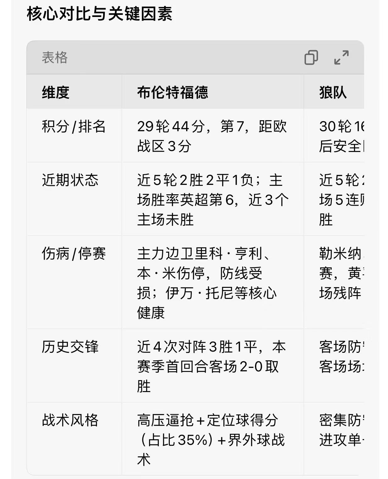对位 布伦特福德球员 狼队球员 胜负关键与影响 。中锋支点 伊万·托尼(15球3助) 基尔曼(领衔中卫) 托尼背身对抗+抢点顶级;基尔曼需协防,避免被定位球轰炸 。边路爆破 姆贝乌莫/沙德(速度突击) 塞梅多(停赛)→替补右路 狼队右路防守薄弱,布伦特福德主攻 。 中场屏障 延森(调度+拦截) 若昂·戈麦斯(伤缺) 狼队中场拦截力骤降,托尼可获得更多中场支持 。
