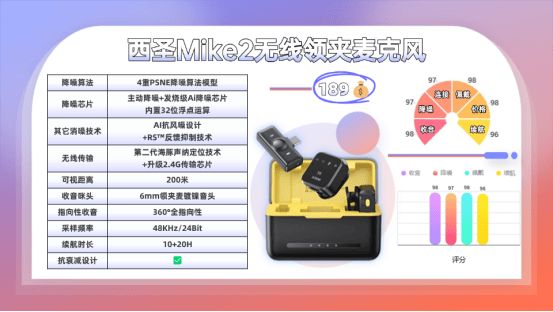比起前代,升级过的西圣Mike Pro,具备了加强版全指向AI感知麦克风、第二代ALPT高密度拾音技术、发烧级Ai降噪芯片等强悍配置。其信噪比达115dB,48kHz/24bit音质采样率,20-20kHz频率响应、0.1%失真率,延迟低至20ms,能够精确捕捉录音的每个瞬间。还智能适配各种设备,并且具备实时监听耳返、高清TFT显示屏等便捷特性。如此完善的体验,不是一般的无线麦克风可以比拟的,带来了目前行业中最佳的使用体验。
