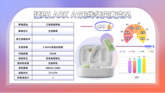 猛玛LARK A1采用优化的拾音与传输结构设计,以提高音频的收录效率和稳定性。这种设计不仅提高了收音清晰度表现,还能降低环境杂音的拾取比例。支持48kHz/24bit高保真采样,频响20Hz-20kHz,信噪比≥67dB,最大声压级120dBSPL。