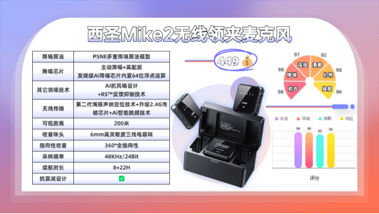 西圣Mike2在产品研发上从不追求多余功能,而是始终坚持“音质体验为先”的理念,专注于发烧级性能,打造了10项收音降噪黑科技。通过创新的“预处理、分割、降噪、提升”四重PSNE降噪算法模型,结合增强版全指向AI感知麦克风、第二代ALPT高密度拾音技术和发烧级AI降噪DSP芯片,西圣Mike2将声音清晰度提升至98%,抗噪性达到96%。为了达到最佳的收音与降噪效果,西圣Mike2对每个细节进行了深度拆解,研究并创新数千个要素,其测试标准远超行业常规。经权威检测机构验证,西圣Mike2的清晰度、动态范围、抗噪性及信噪比等核心数据,在千元内产品中无可匹敌,真正实现了行业领先。