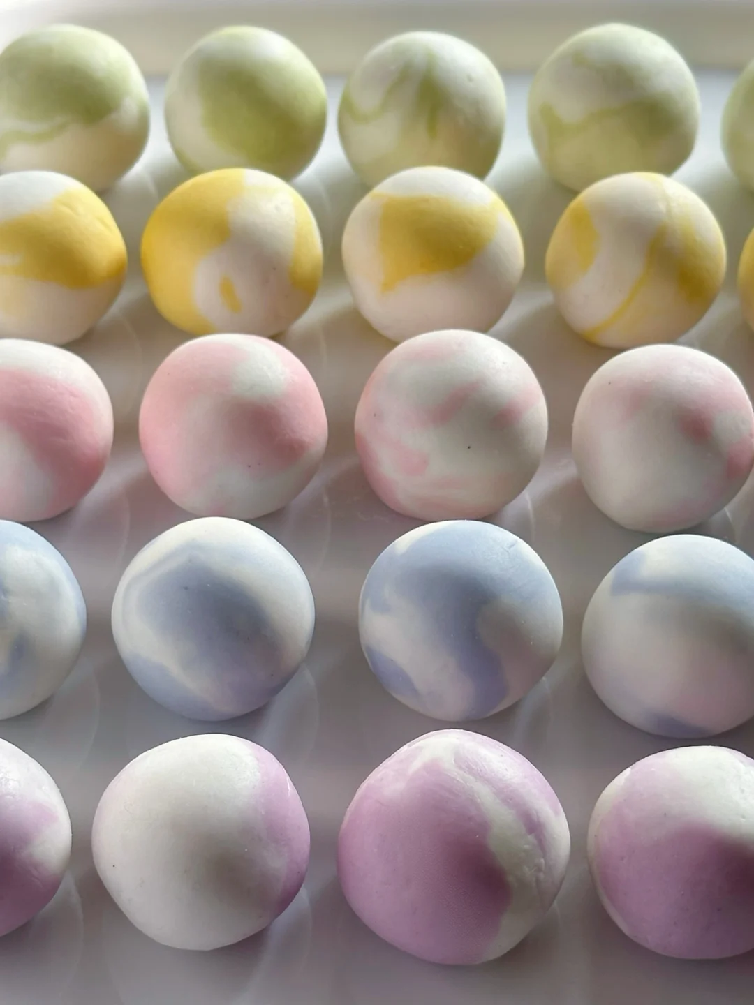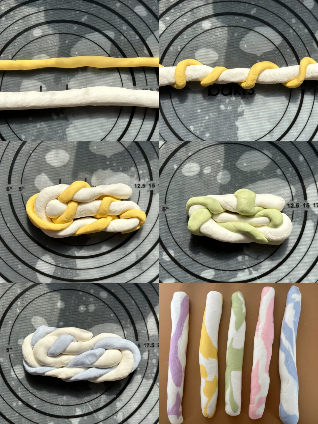 🔺将原色和彩色的分别搓成长条,拧在一起,再折叠起来,搓成长条,再分成小团。