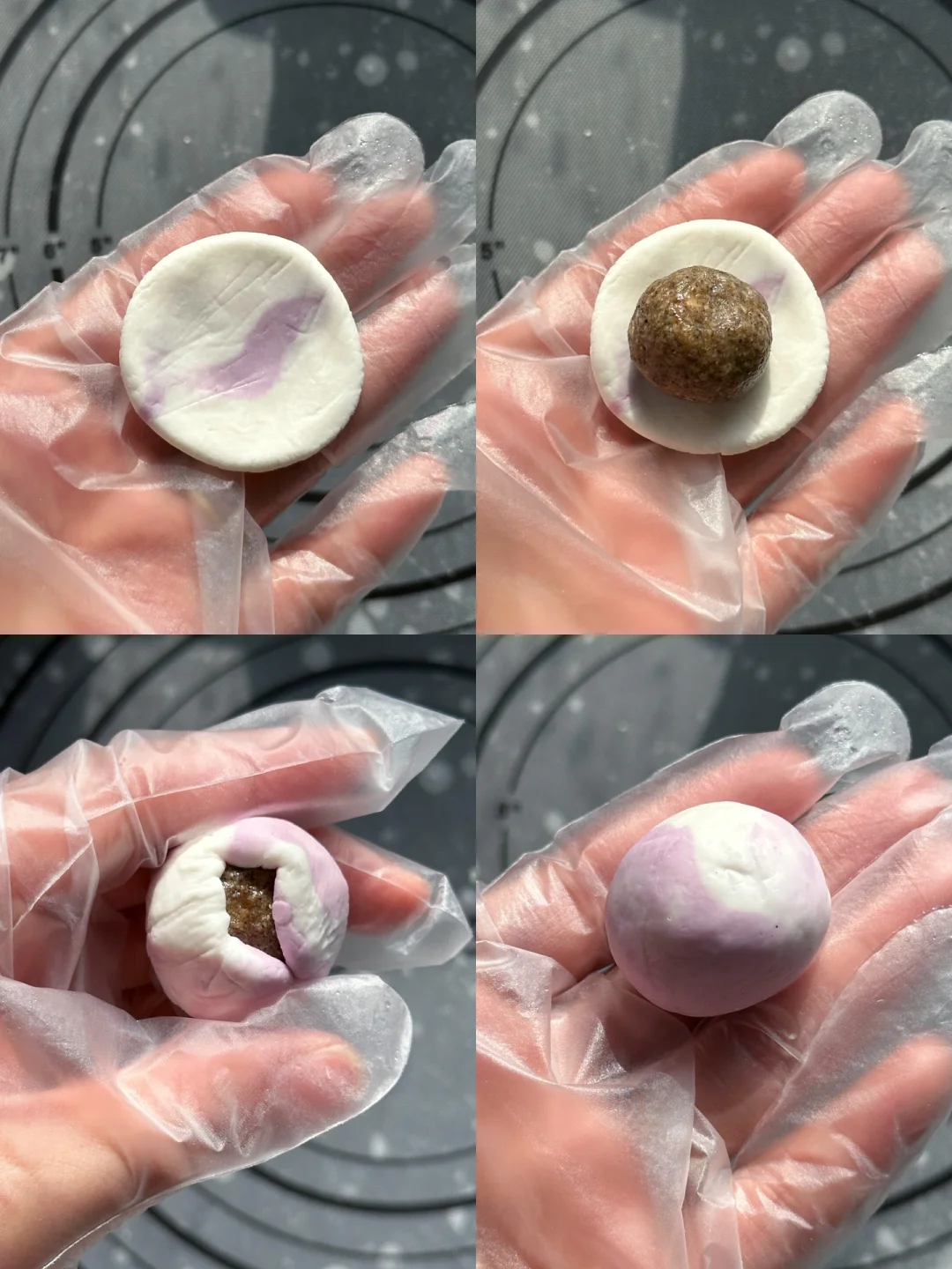 🔺取一小团面放入一个馅包好,包的时候多余的粉团需要盖保鲜膜仿干!