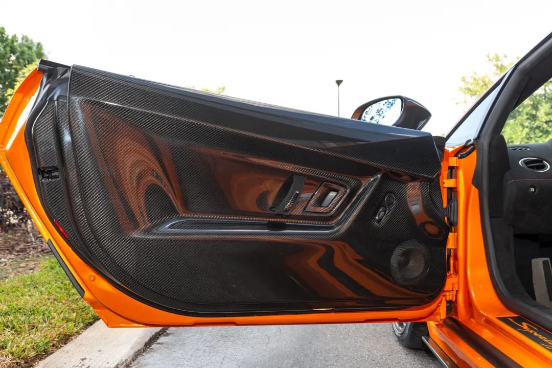后扩散器、车身底部覆盖件、后视镜和门板也采用碳纤维制成。通过将玻璃替换为透明聚碳酸酯,进一步减轻了重量。内饰方面,采用了由Alcantara包覆的单体碳纤维运动座椅。