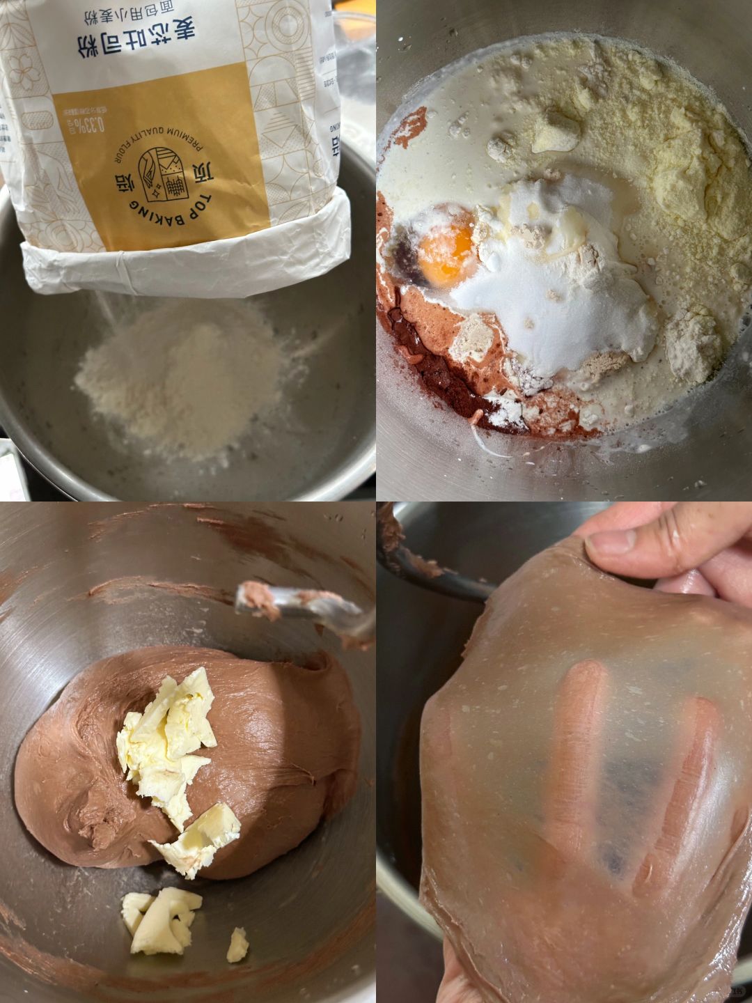 1️⃣ 除黄油以外的所有面团材料放入厨师机桶内厨师机1或2档搅拌至无干粉,切换至5~6档打面10分钟左右,能扯出厚膜,加入软化好的黄油开3档揉至黄油吸收,再切换至5-6档揉至完全拓展阶段,能扯出薄膜即可。