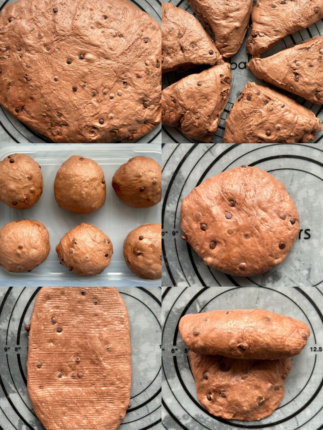 3️⃣取出发酵好的面团,按压排气,将面团分成大小均匀的六个面团,滚圆盖保鲜膜松弛20分钟。