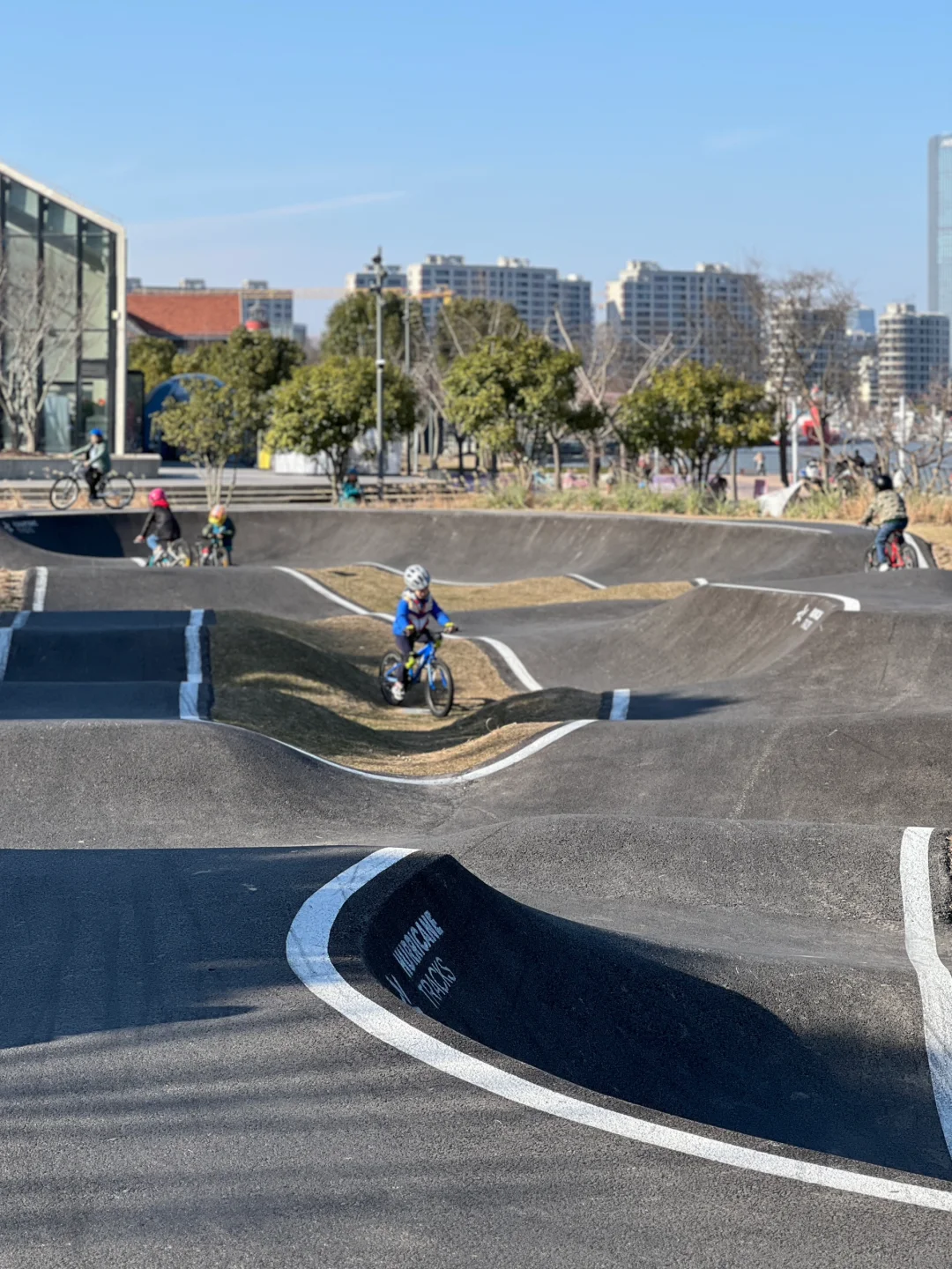 有滑梯、攀岩墙、跷跷板、转转杯,旁边有个泵道区,滑板车🛴自行车🚲轮滑、山地车都可进入,周末人挺多,每场12人需排队入场。
