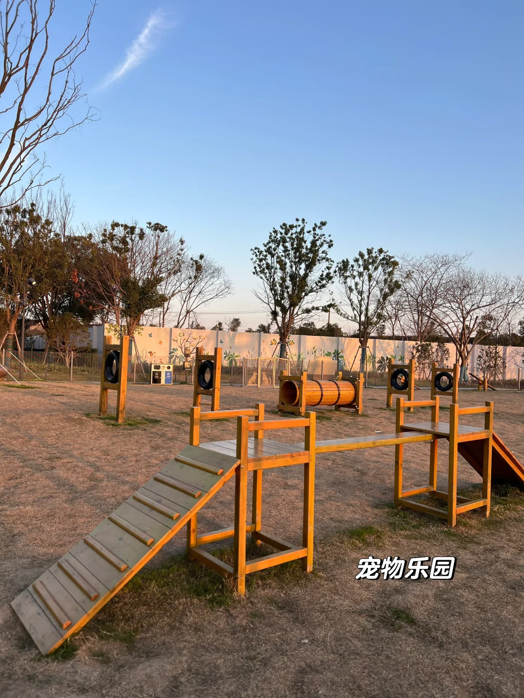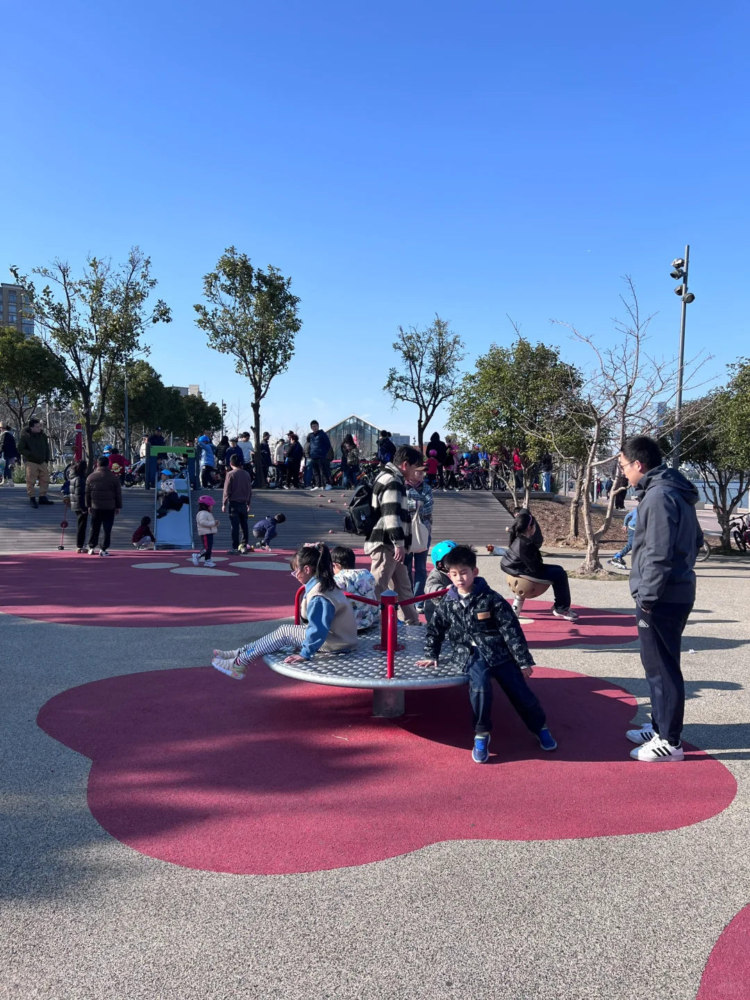 下船后右转到步道,骑行2.5km到达童心乐园。相较于山楂花这里场地更开阔,有攀爬网、沙坑、滑梯、蹦床,松鼠松果爬网组合童趣可爱,旁边竟然有个宠物乐园。