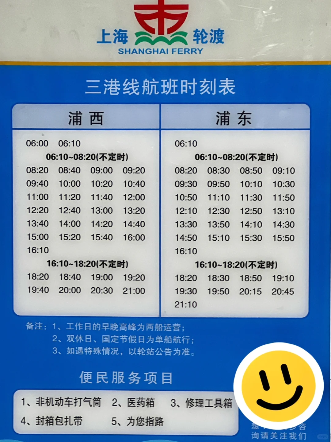 步行900米到港口渡口↔️三林渡口,单程船票2r/人,自行车2.8r/人,🉑刷交通卡或者公共交通乘车码,三港线班次贴在后面。