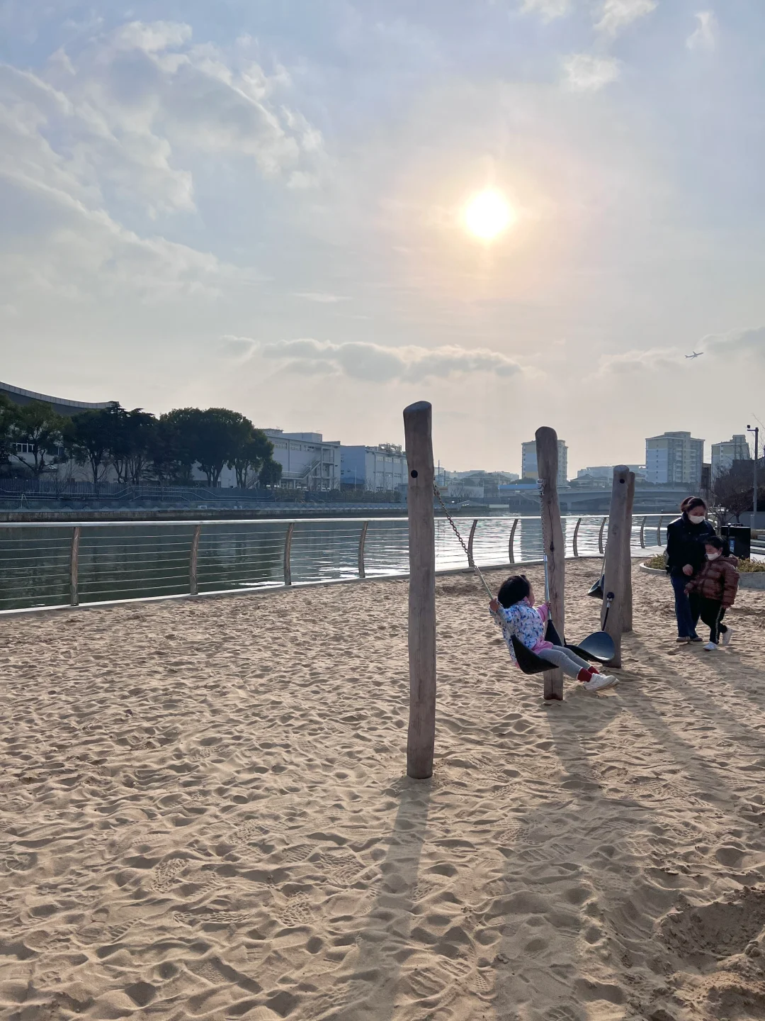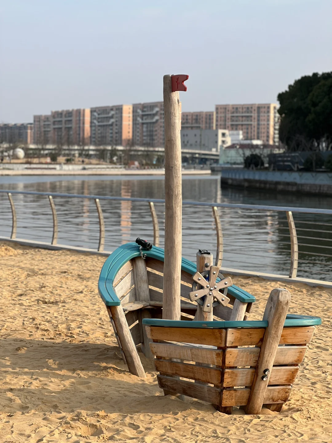 沿着河畔步道过桥就是另外一片玩乐区,主要以玩沙为主,沙池面积很大可以称之为“沙滩”hhh…有秋千和船。