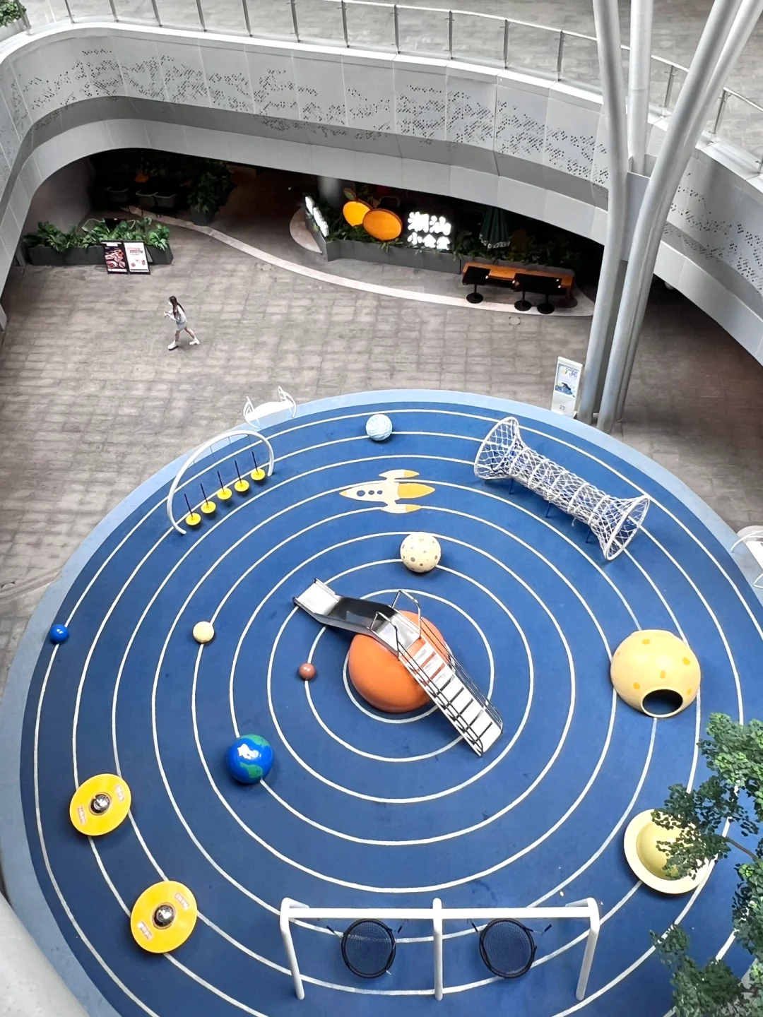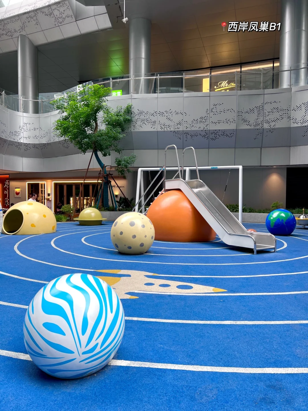 B1户外中庭星际主题儿童乐园,爬网、滑梯🛝秋千,旁边就是多家餐厅。