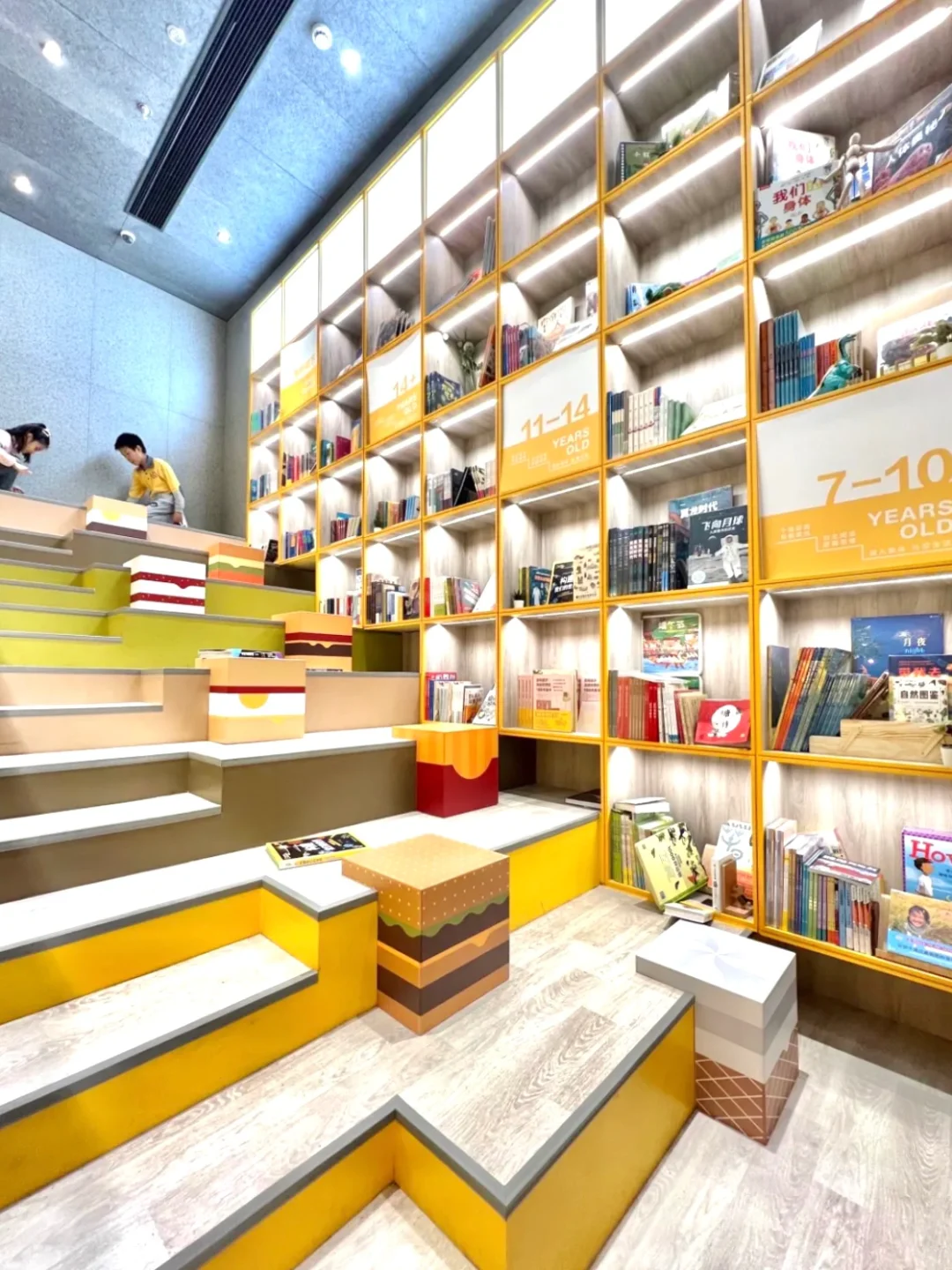 一层书店+咖啡馆,二层为餐厅。芝士造型书店,互动Led屏,书架座椅也都是薯条汉堡的造型,太可爱啦~