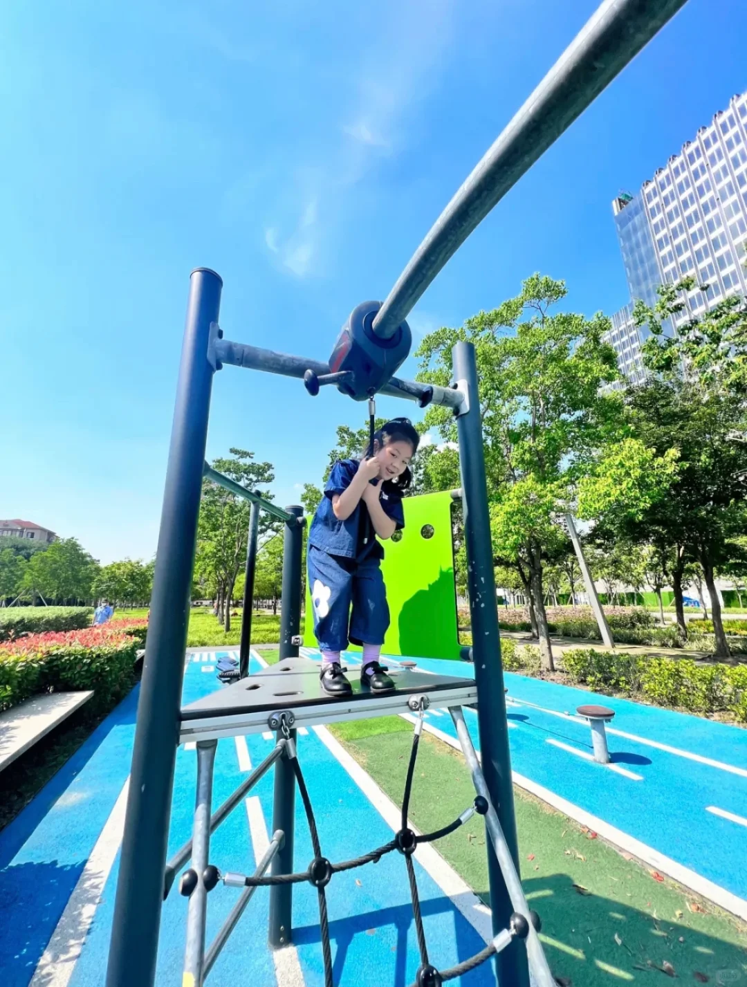 有不锈钢滑梯、攀岩、旋转游戏和滑杆,色彩鲜艳的塑胶跑道,人少景美可以冲!
