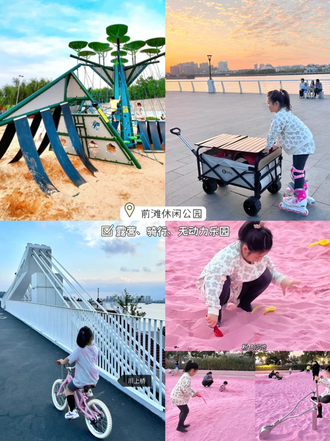 有网红沙坑儿童乐园、霁华壁儿童乐园和粉沙滩3块玩乐区域,大沙坑、攀爬绳网、滑梯,可以江边露营🏕️骑行。