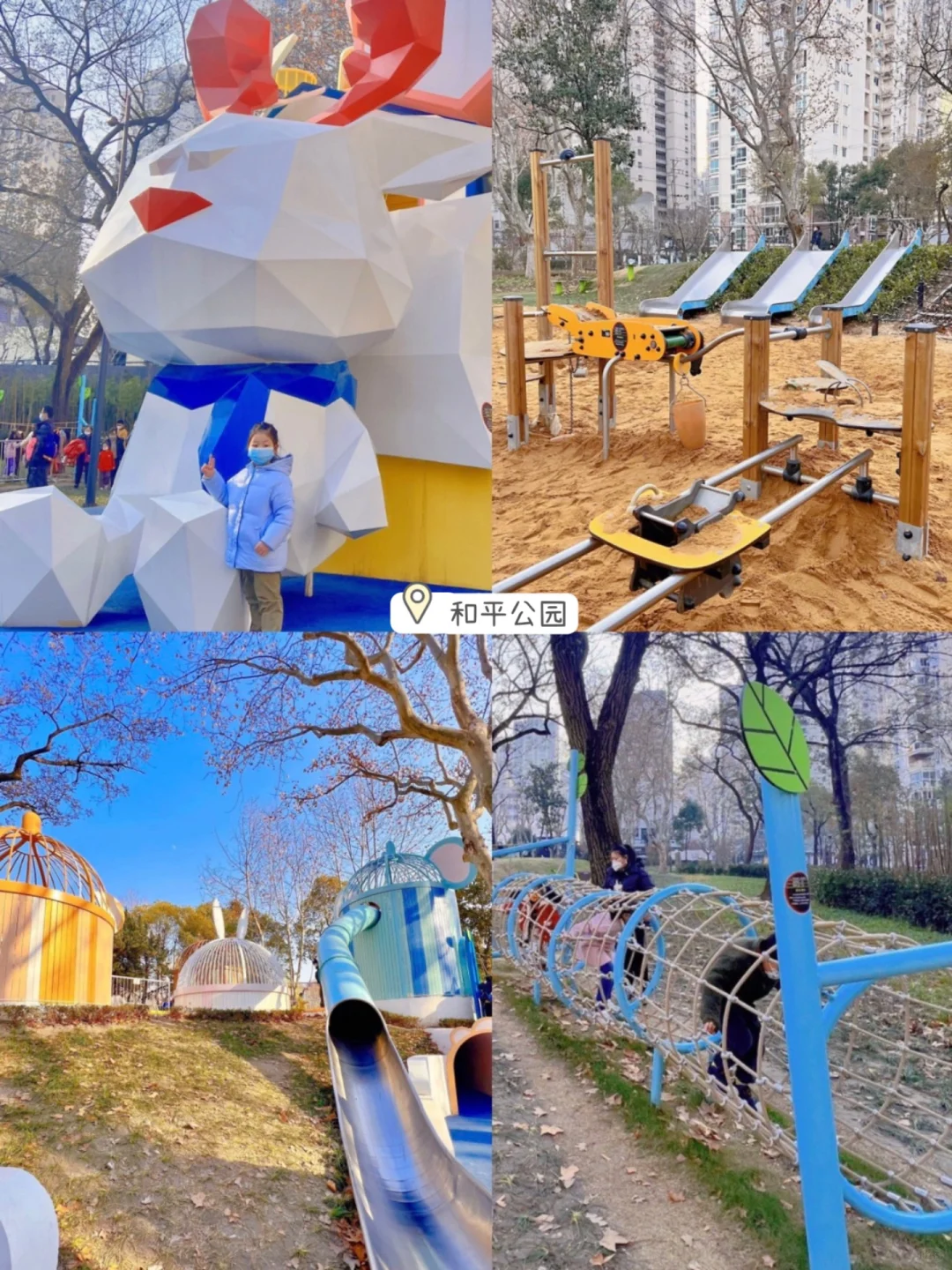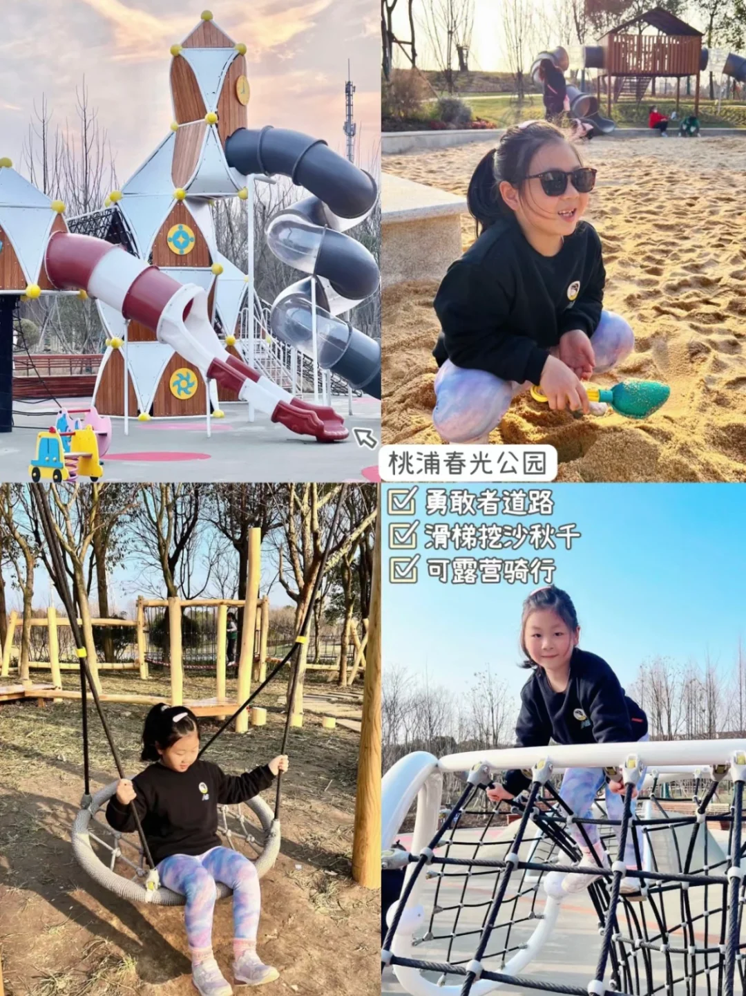 有沙池滑梯、攀岩墙爬网、勇敢者道路蹦床,可带滑板车和平衡车过来玩。
