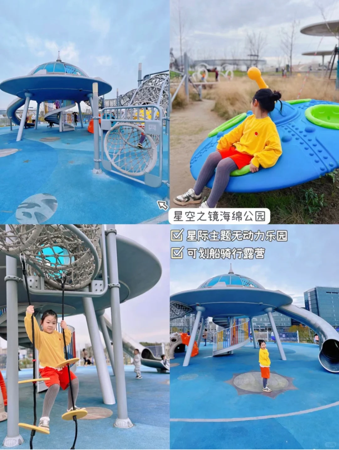 比邻天文馆的星际主题公园,有大草坪可露营野餐🏕️、划船🚣和骑行🚴,儿童乐园是UFO🛸造型的滑梯爬网。