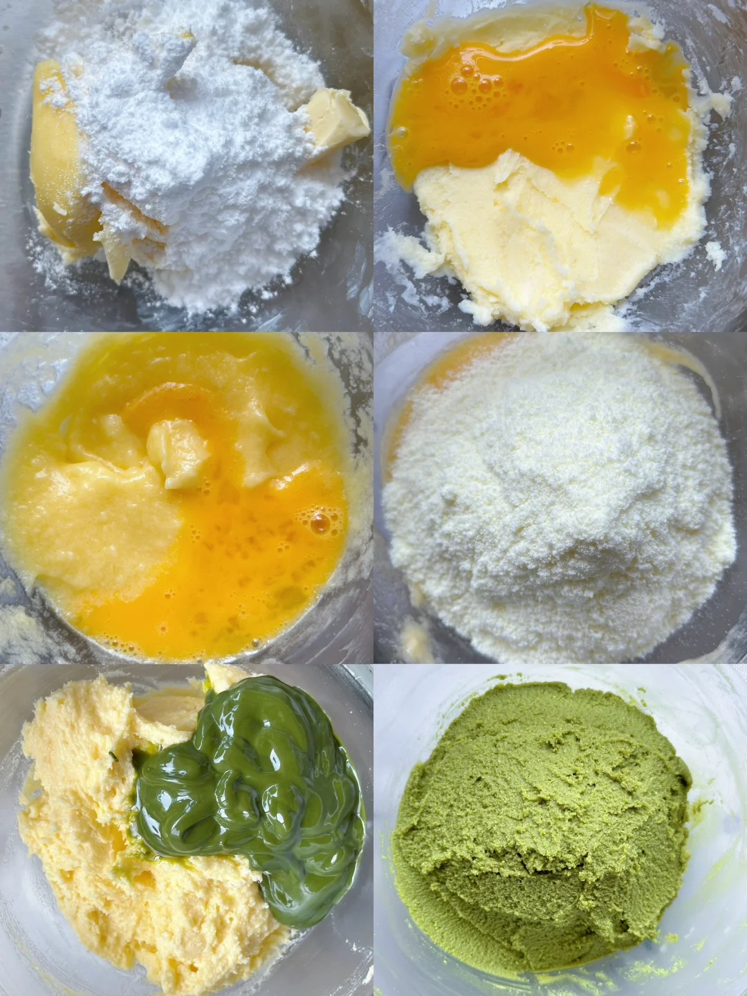 3️⃣制作奶酥馅,黄油软化加入糖粉,压拌均匀,分次加入蛋液,搅拌均匀,加入奶粉拌匀,再加入开心果酱搅拌均匀备用。