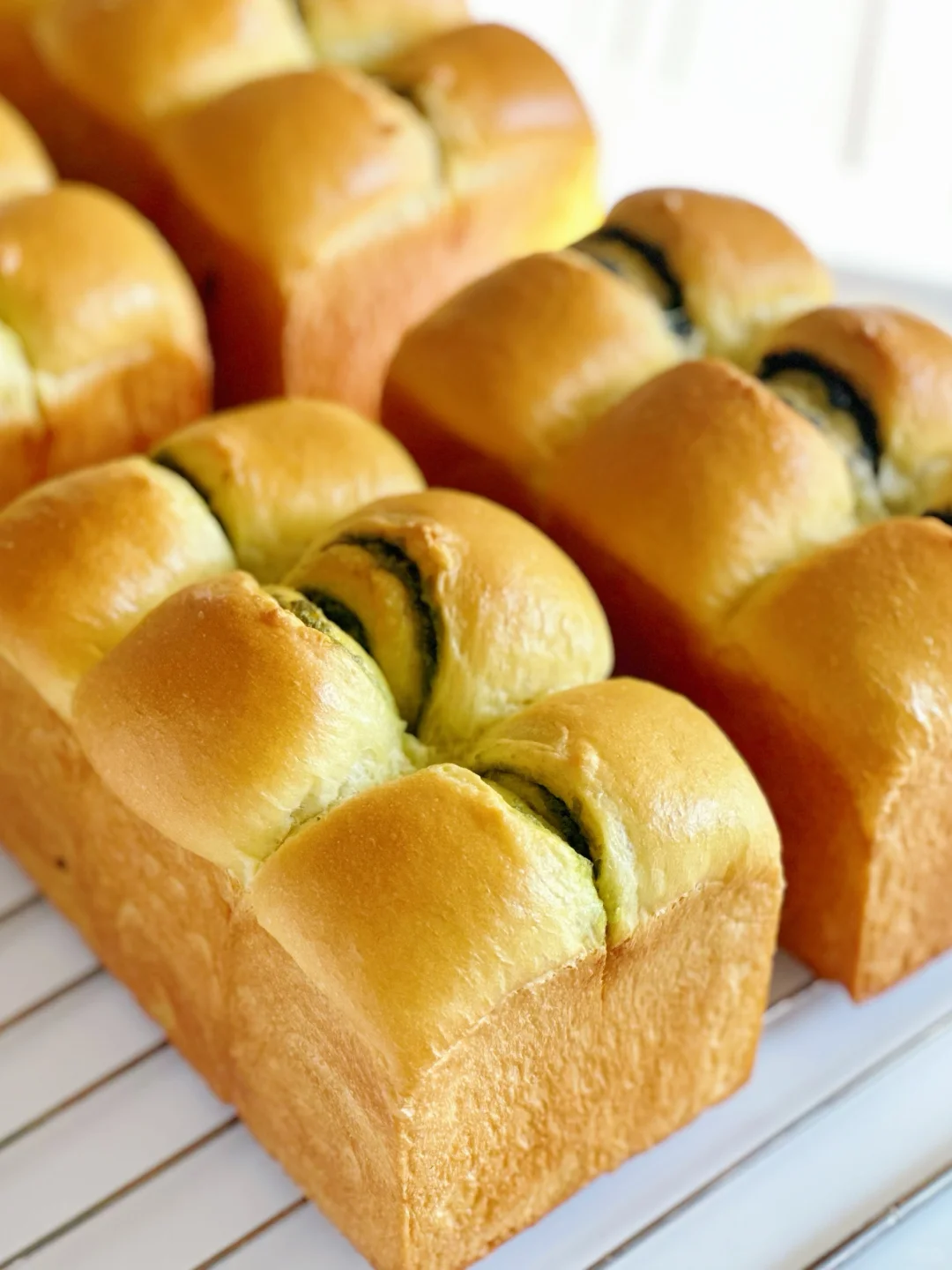 5️⃣取一个松弛好的面团,擀长,翻面抹上奶酥馅,从上往下卷起。