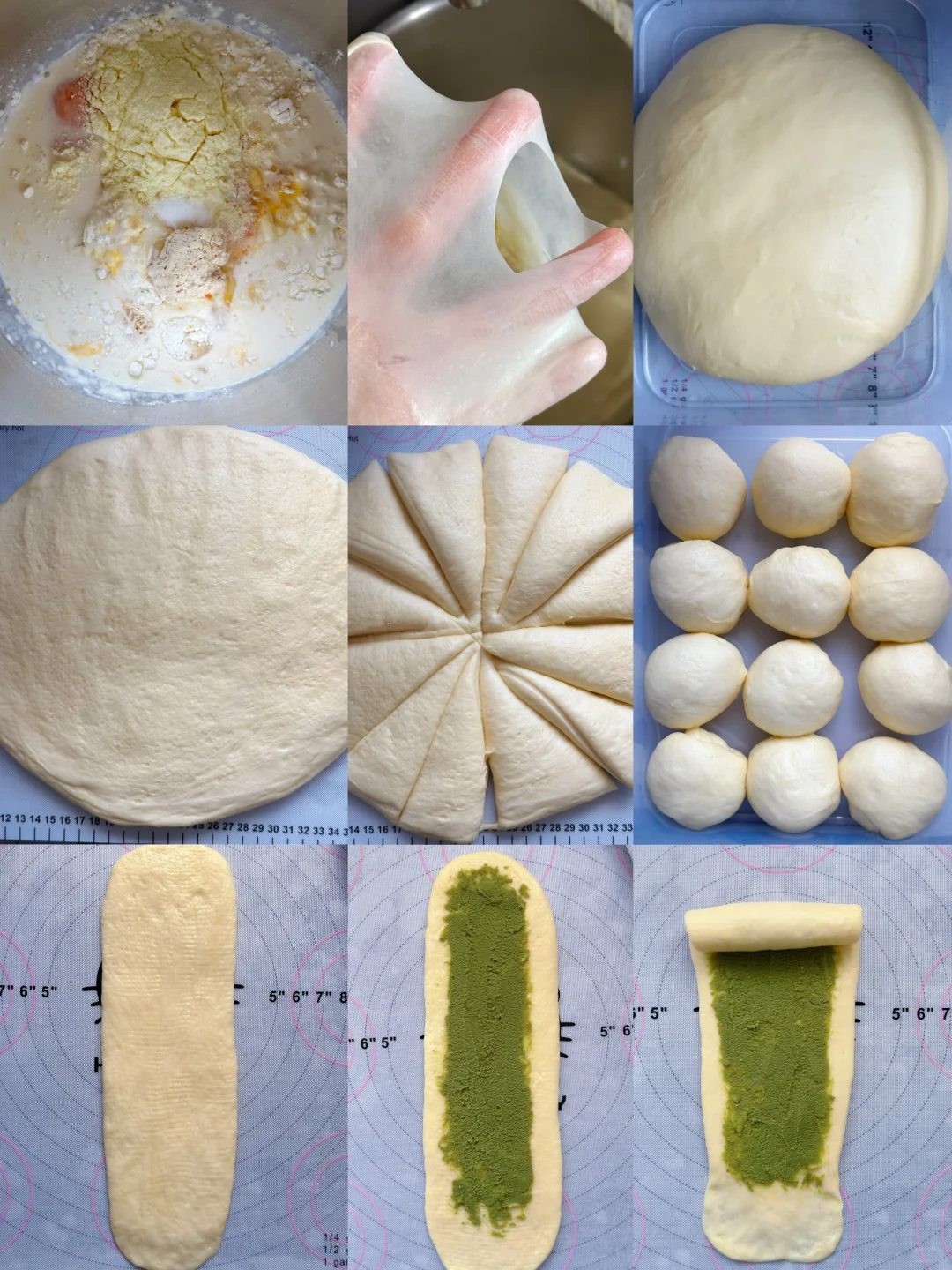 1️⃣除黄油外的所有食材放入厨师机桶内,厨师机1或2档搅拌至无干粉,切换至5~6档打面10分钟左右,能扯出厚膜,加入软化好的黄油开3档揉至黄油吸收,再切换至5-6档揉至完全拓展阶段,能扯出薄膜即可。