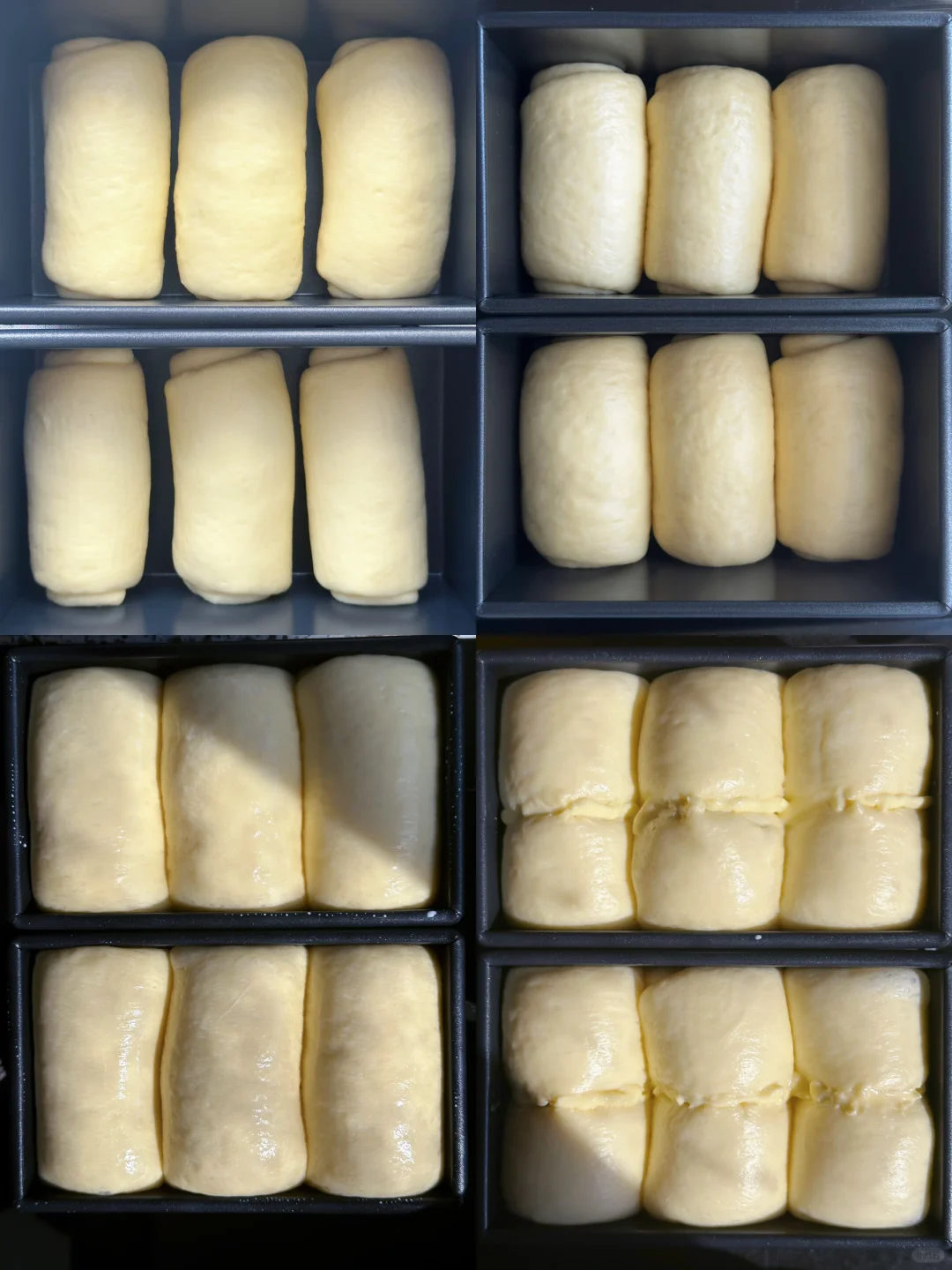 5️⃣依次做好, 放入模具中,在温度32°C左右,湿度80%的环境下发酵至模具十分满,用剪刀在每个峰中间剪开,挤少许黄油