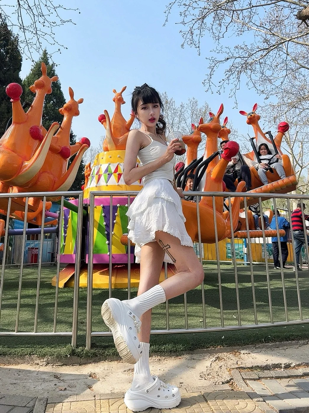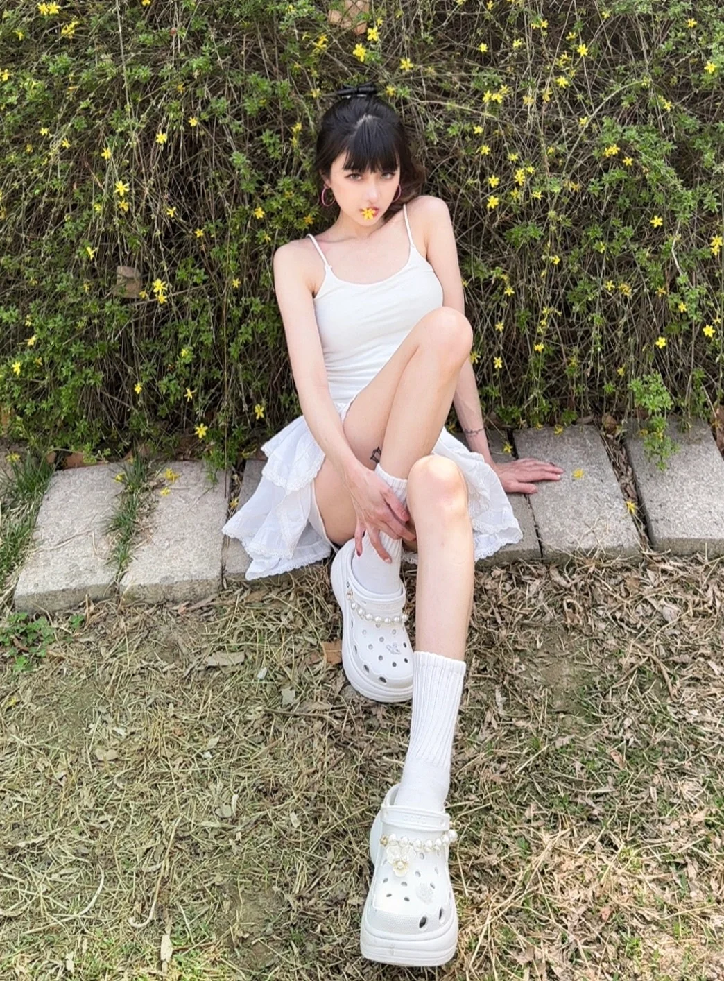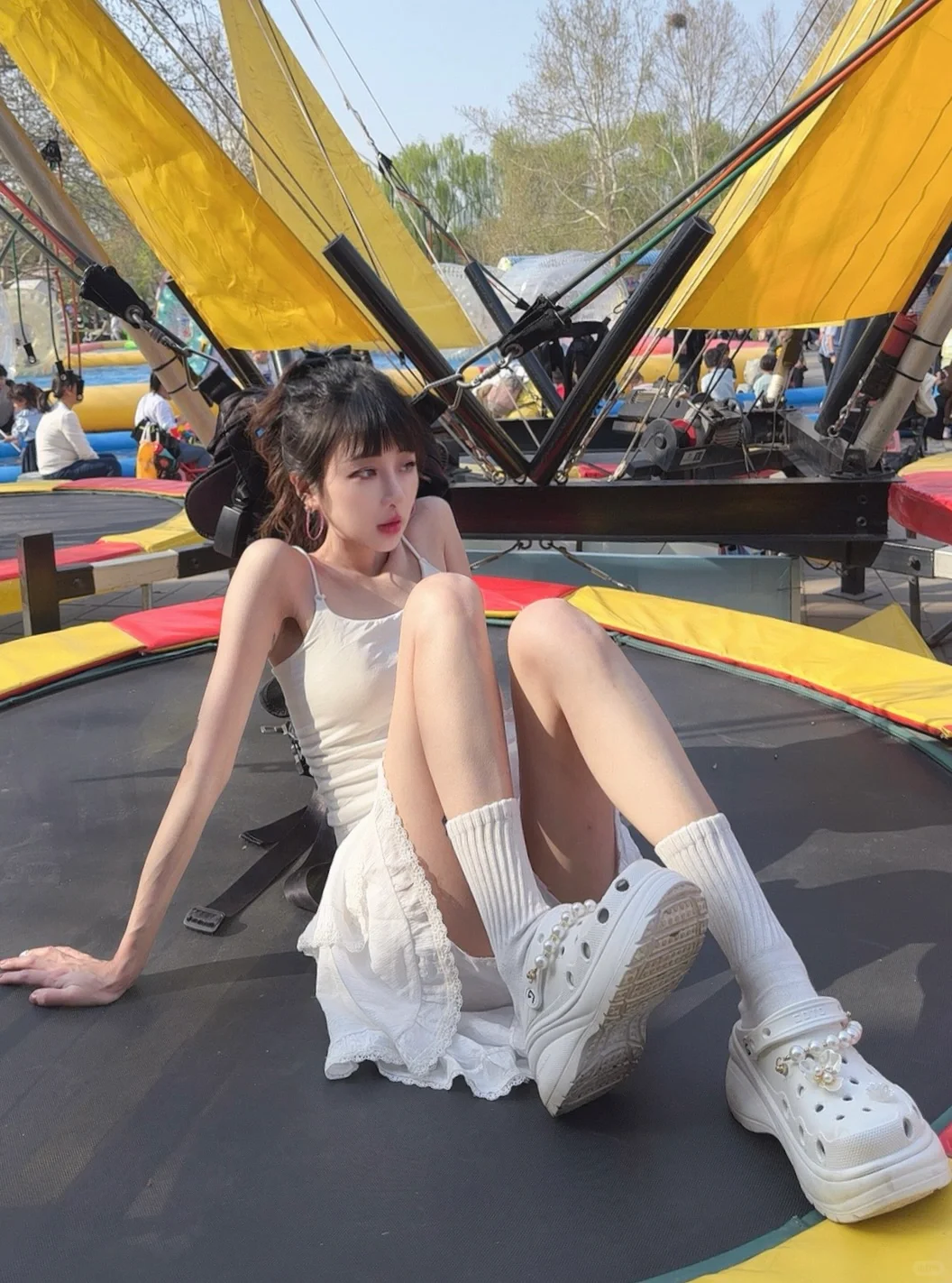 3月底北京明明还是寒冷干燥的 随着假期的到来突然进入了白天27度高温的强烈紫外线暴击 但也拦不住放假大家冲击公园野餐露营的心 因为公园里的花都开啦~ 五彩斑斓的公园最适合全身白的穿搭 不管怎么拍都好看 一定要搭配同色洞洞鞋 就算玩一整天也不怕脚会累啦~ 还有户外玩耍有强烈紫外线 建议大家一定一定要做好防晒!!毕竟距离夏天还有两个月呢!