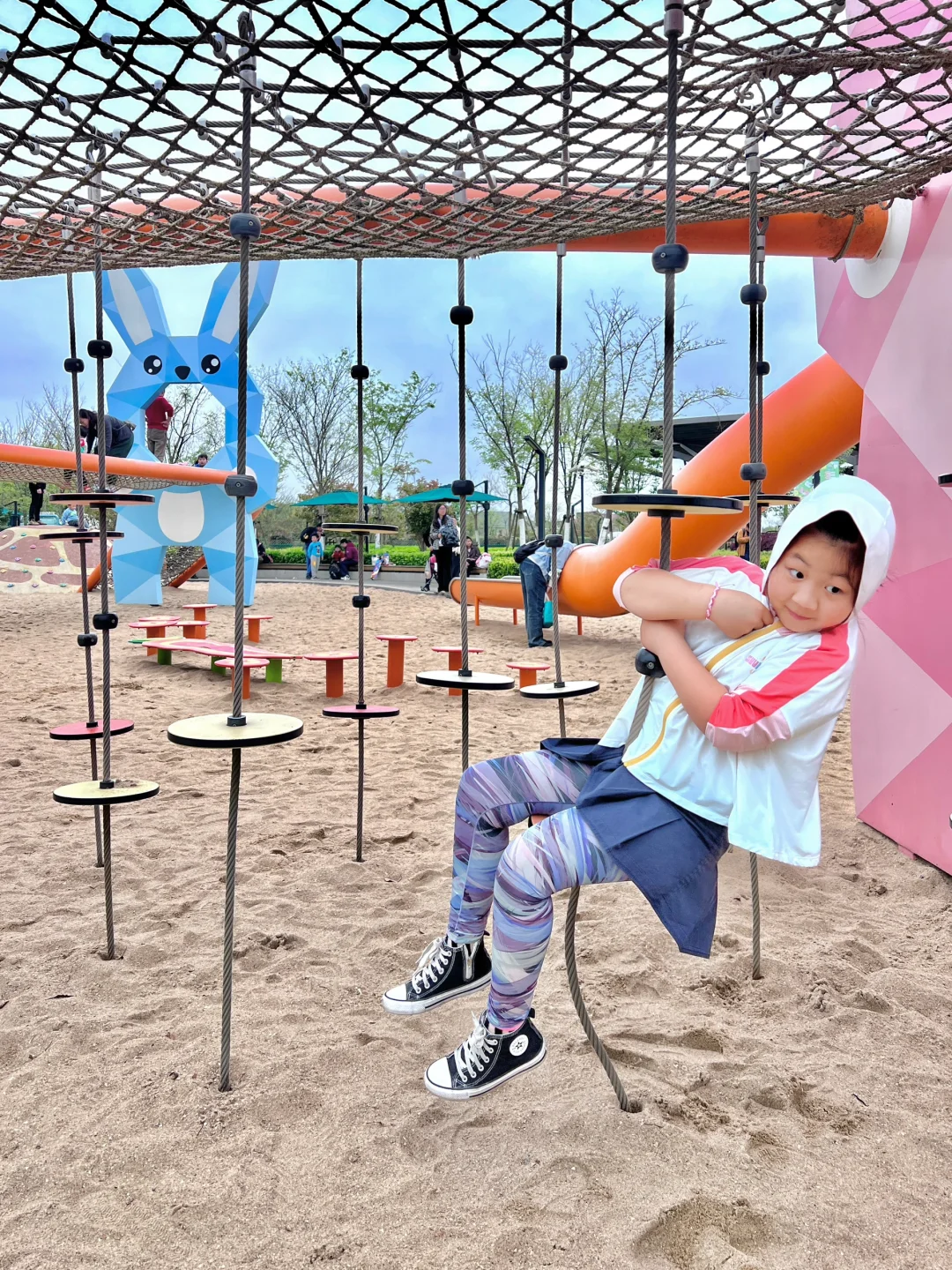 天空城堡爬网旋转滑梯(适合大点的孩子能独立上去)、蹦蹦云、玩水区(很多有趣的玩水装置)、滑索、沙坑