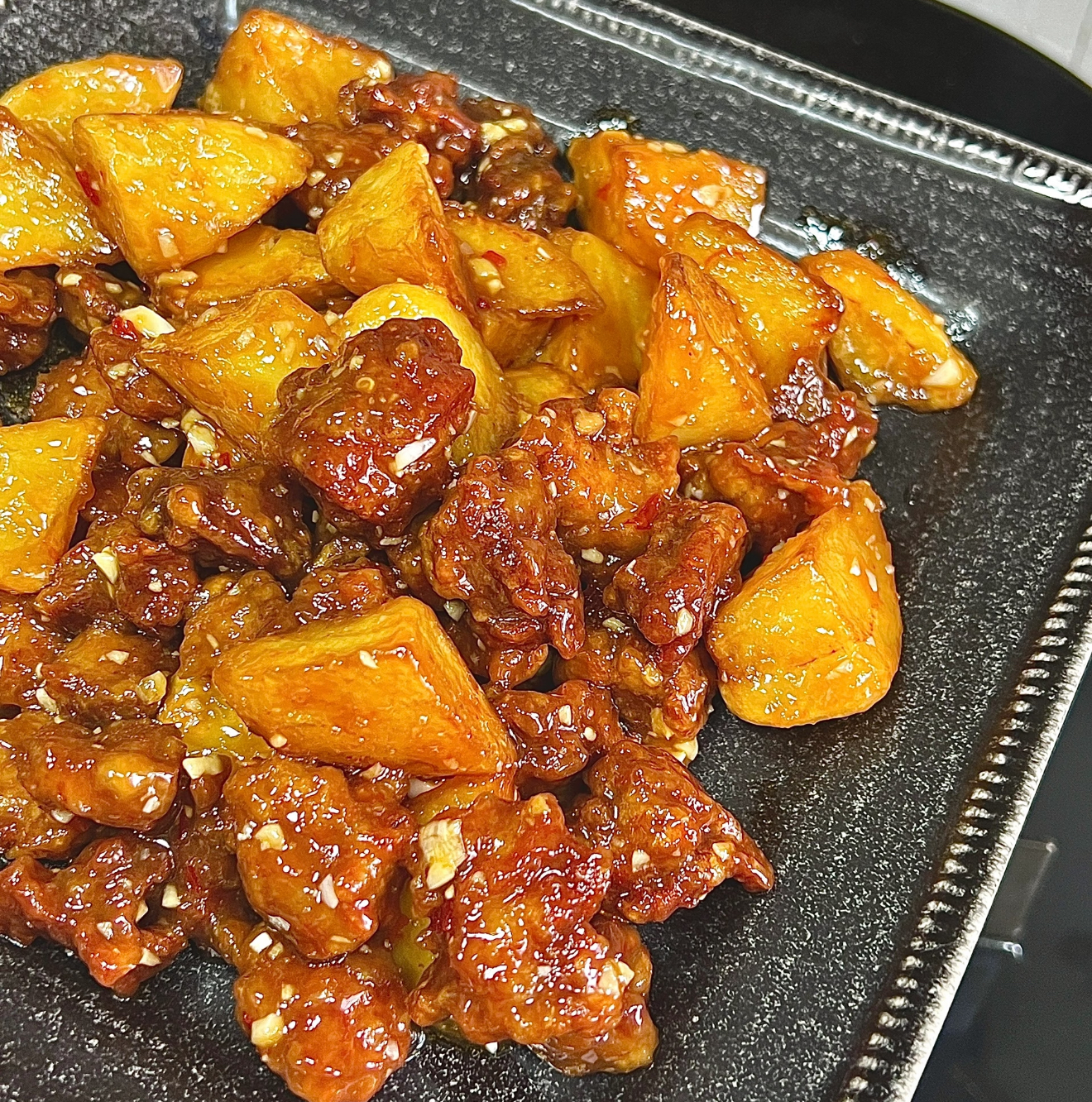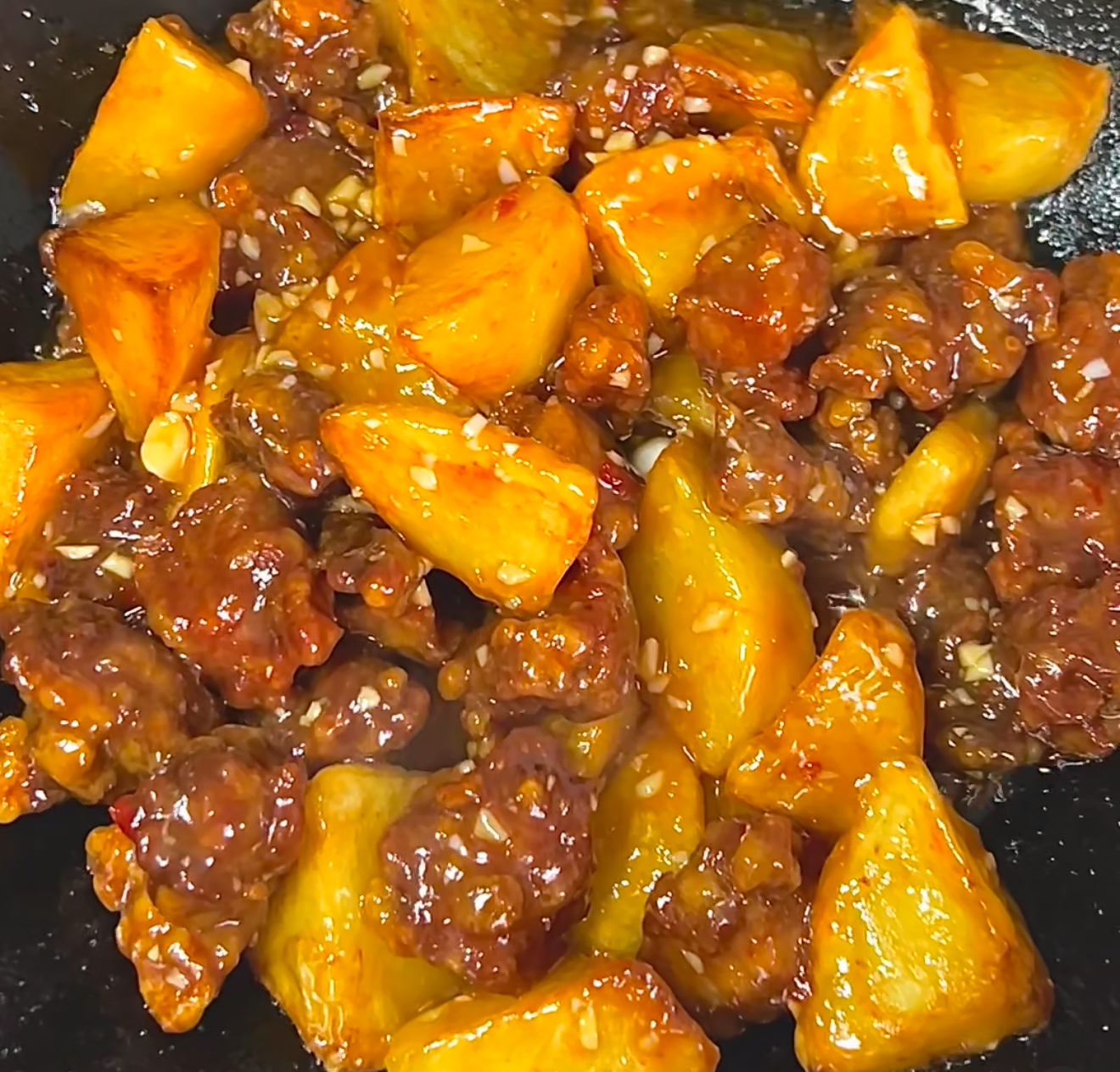 留底油爆香蒜末,转小火加番茄酱炒出红油,倒入白醋+白糖+半碗水淀粉,煮到冒大泡时迅速倒入炸好的肉和土豆块(或菠萝),快速翻炒让每块肉都裹上酱汁。