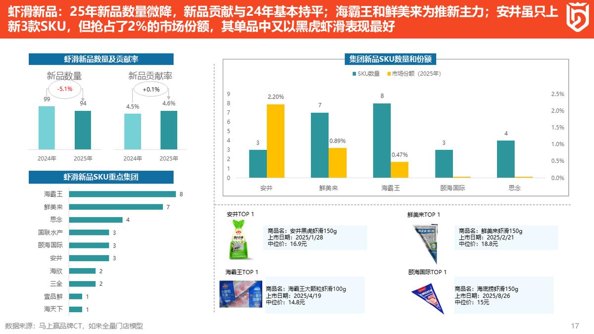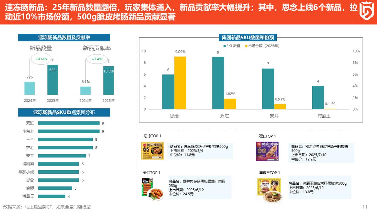 最后从新品角度来看速冻肠类目的发展情况。从左上角的新品数量及新品贡献率可以看到,速冻肠赛道有非常多新品在快速涌入,2024年有226个新品,到2025年的时候则有523个新品,相较去年翻了一倍还多。从新品贡献率,即当年新品销售额占到当年类目整体销售额的占比来看,速冻肠从2024年的6.1%提升到了2025年的13.5%,一般新品贡献率超过5%就是比较大的贡献了,意味着消费者对于类目新品的接受程度也比较高、厂商出新的意愿与推新的资源投入也比较大,两者都对类目未来有着较为积极的态度与期待。