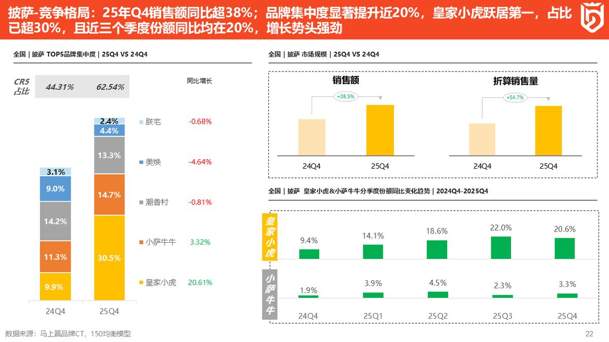 市场规模上,披萨品类的销售额增长了38.5%,折算销售量增长了54.7%,特别的一点是销售量的增长大于销售额,反映出赛道价格面临着激烈的竞争。